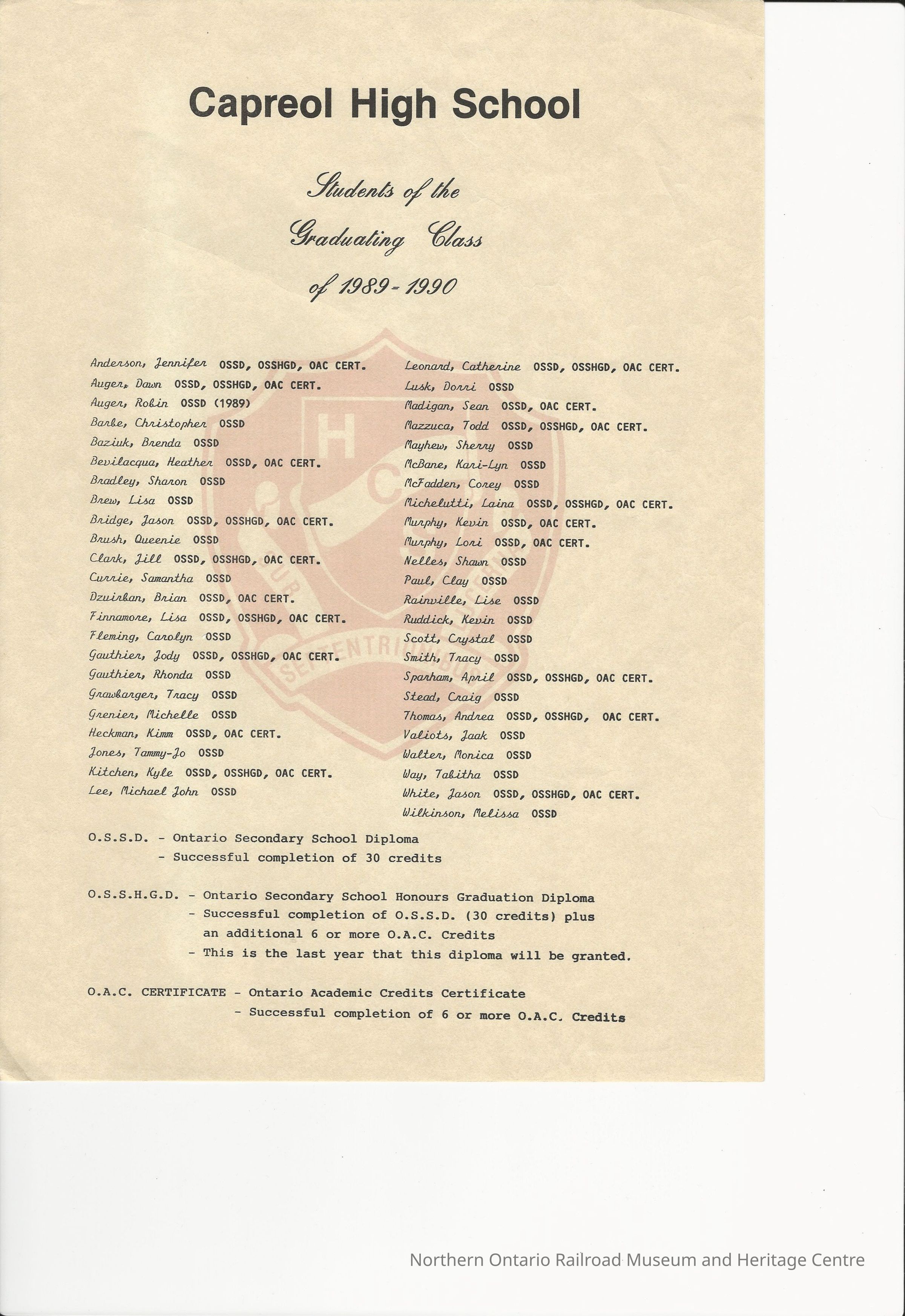 List of all of the members of the graduating class of the Capreol High School in the year 1990. It list their names as well as their qualifications being: OSSD: Ontario Secondary School Diploma Successful completion of 30 credits, or OAC Certification: Ontario Academic Credits Certificate successful completion of 6 or more OAC credits, or OSSHGD: Ontario Secondary School Honours Graduation Diploma.