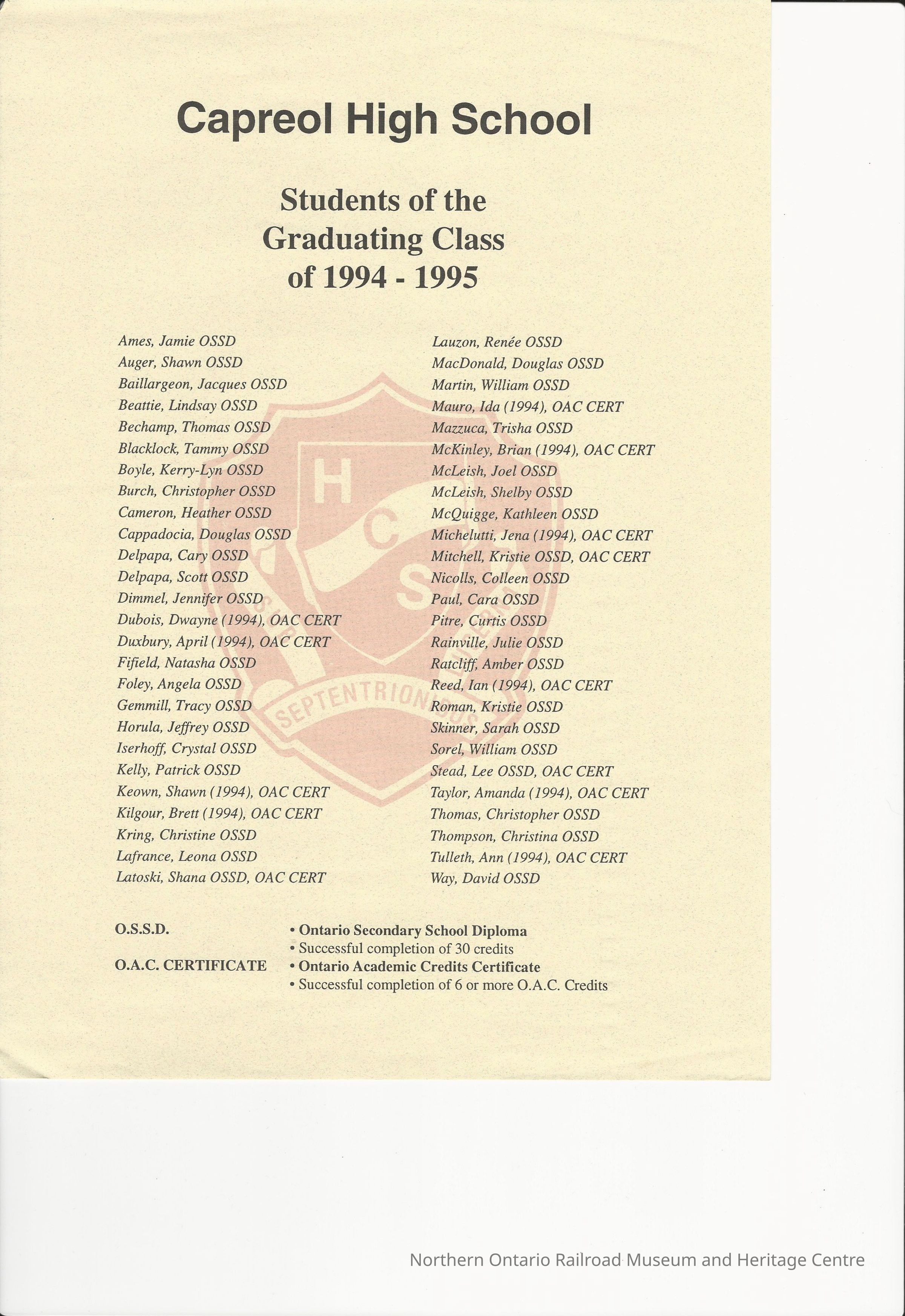 List of all of the members of the graduating class of the Capreol High School in the year 1994-1995. It list their names as well as their qualifications being: OSSD: Ontario Secondary School Diploma Successful completion of 30 credits, or OAC Certification: Ontario Academic Credits Certificate successful completion of 6 or more OAC credits