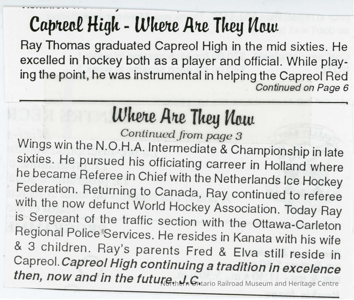 "Capreol High: Where are they now? Ray Thomas" in Capreol Newspaper(?). Mentions Ray Thomas career briefly as well job now as Sergeant in Ottawa-Carelton Police Services position.Collection