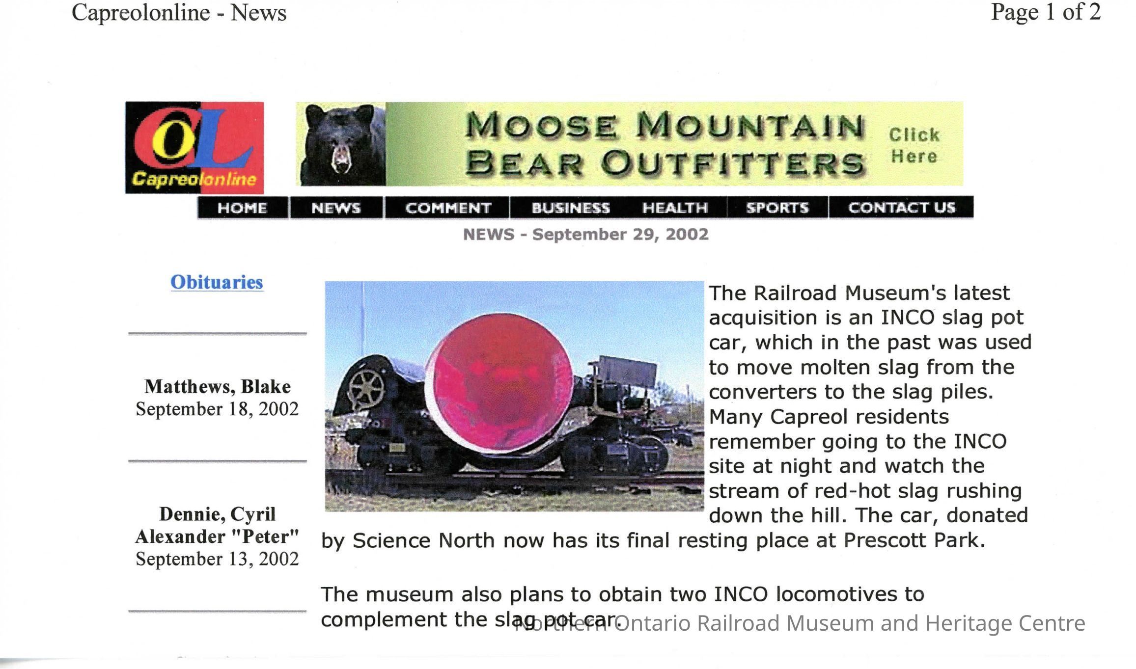 Capreol Online Slag Pot Arrives at NORMHC Article (September 29, 2002). Outlines arrival of slag pot car to museum, and plans for future, donated by Science North. Printed web article.Collection