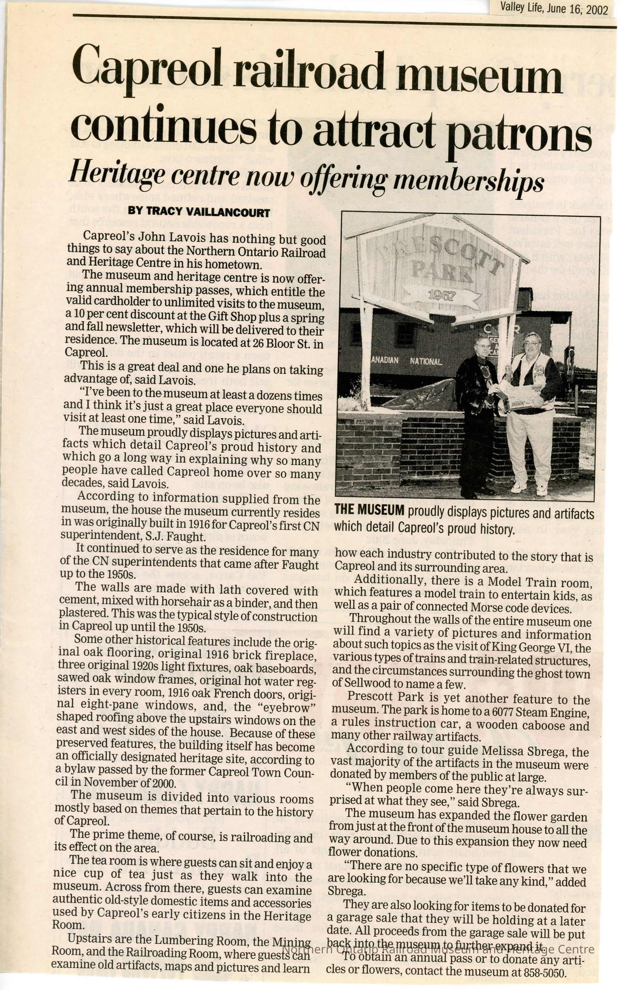 "Capreol railroad museum continues to attract patrons" in Valley Life, June 16, 2002. Features Prescott Park and Bob Michelutti.Collection