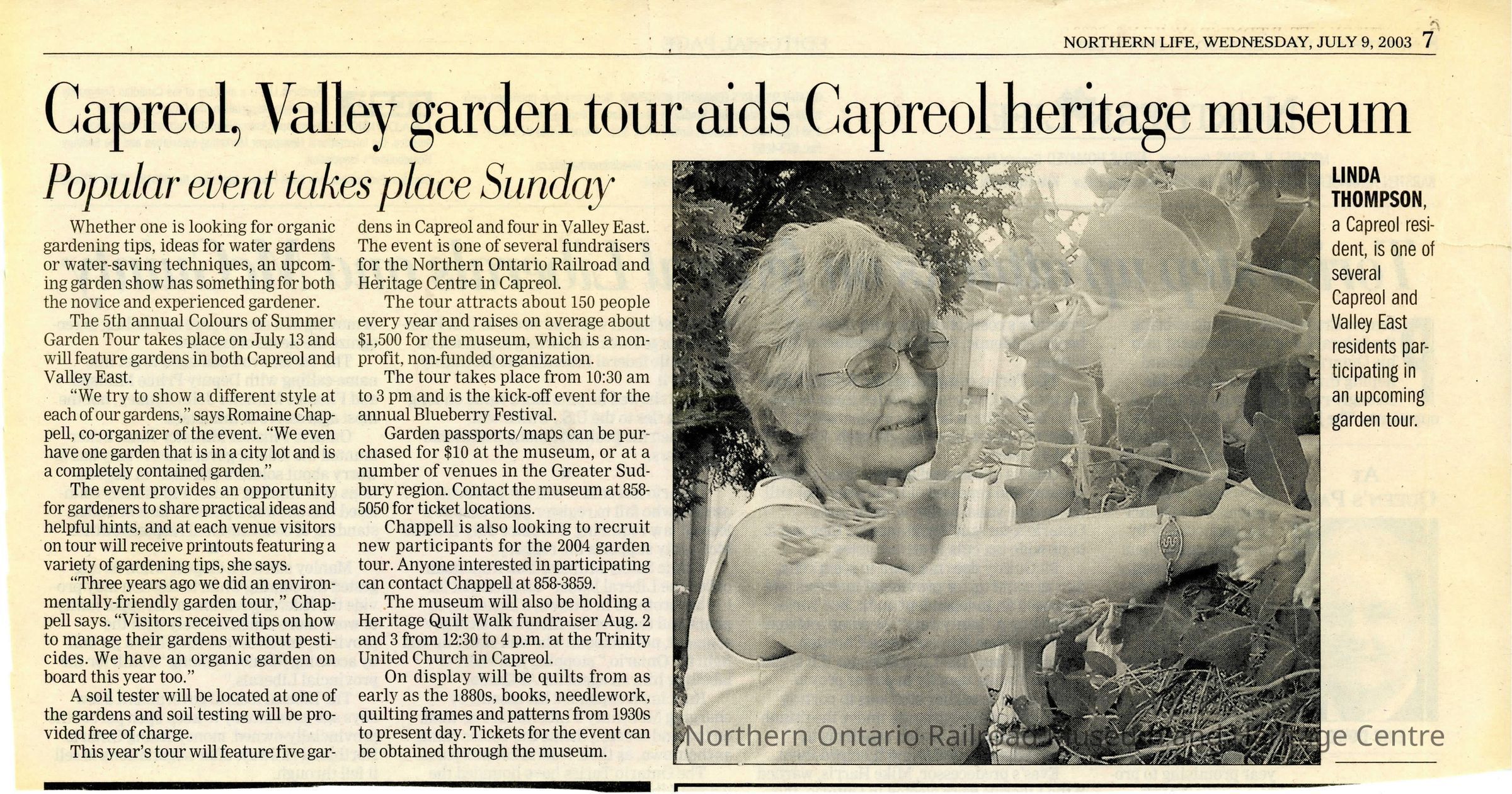 "Capreol, Valley garden tour aids Capreol heritage museum" in Northern Life on July 9, 2003, featuring Linda Thompson and the Garden tour for NORMHCCollection