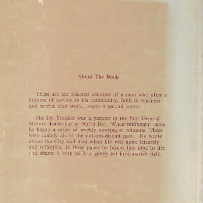 Book containing a compilation of columns pertaining to North Bay's history, written by Hartley Trussler, compiled by Michael Barnes.Context