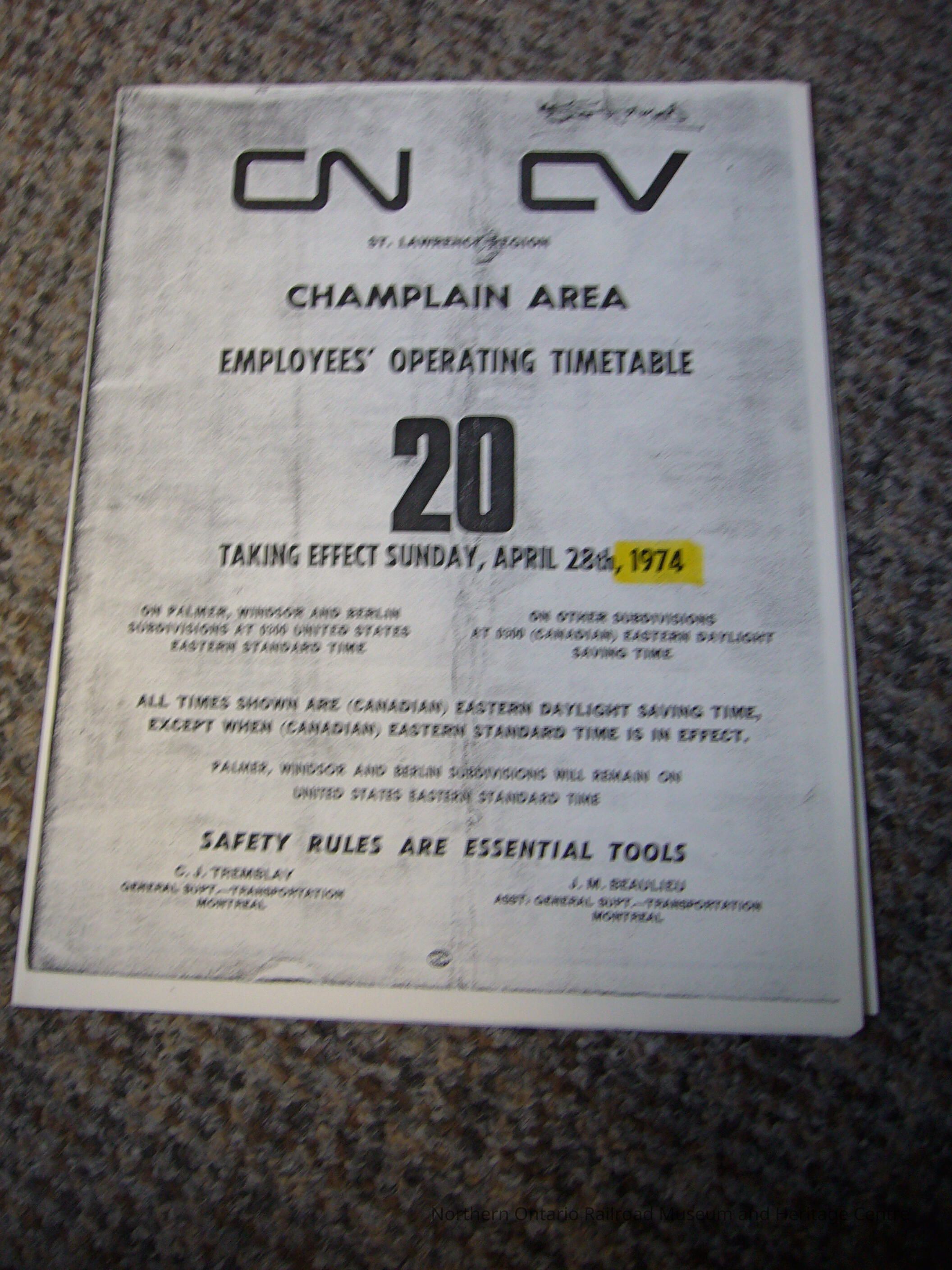 Champlain Area Employees operating timetable April 28th 1974Entry/Object ID
