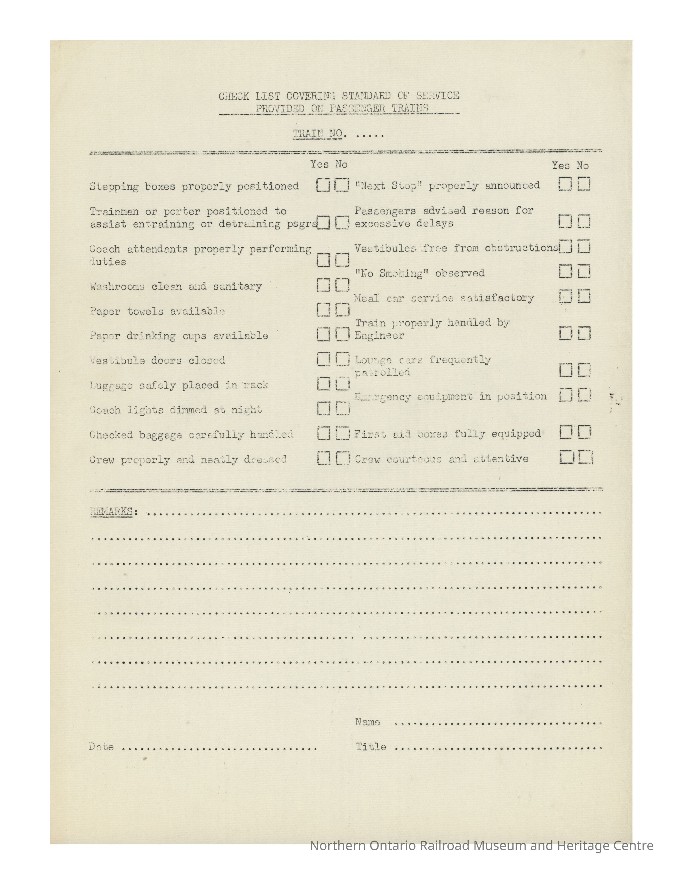 A checklist describing the proper operation of a passenger train.Collection