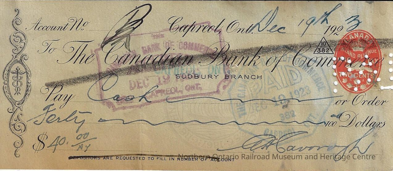 Cheque written and paid to the Canadian Bank of Commerce for the amount of $40.00 on December 19th, 1923Context