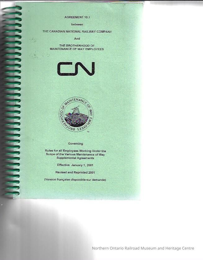 Book, maintenance of way from Canadian National, agreement 10.1 governing rules for all employees working under the scope of the various maintenance of way supplemental agreements. Includes: coverage, hours of service and meal period, hours of rest, work week, assignment of rest days, relief assignments, training, overtime and calls, employees assigned to higher-rated and lower rated positions, general holidays, traveling or detained on orders of the company, wet and stormy days, temporary transfer, positions not subject to rules of promotion, bulletining and filling positions, seniority status and lists, discipline and grievance procedure, final disposition of grievances, manning new lines or extensions, leave of absence and transportation, meals and lodging, attending court or investigations, section houses and dwellings, vacation with pay, shift differentials, compensations for additional positions or classifications, injured on duty, paid maternity leave plan, bereavement leave, life insurance upon retirement, dental and extended health plan, contracting out, general, certificate of service, in term committee, employment security and income maintenance plan, deduction of dues, jurisdiction, season staff reduction, heath and welfare, printing of agreements, duration of agreements.