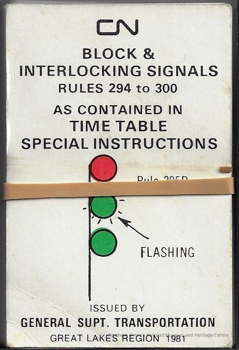 Set of flash cards, Canadian National block and interlocking signals rules 294 to 300 as contained in time table special instruction. These cards would have been used to study the different types of signals that signal employees would need to memorize.