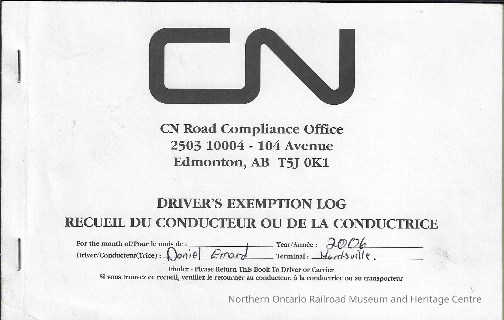 Set of three booklets, Canadian National branded driver's exemption logs. All three booklets are from the year 2006, two belonged to Daniel Emard, the third belongs to H.R. McIntosch. The books recorded: employee name, employee signature, employee pin number, home terminal, supervisor, hours worked, days worked, vacation, the federal drivers hours of service regulations.