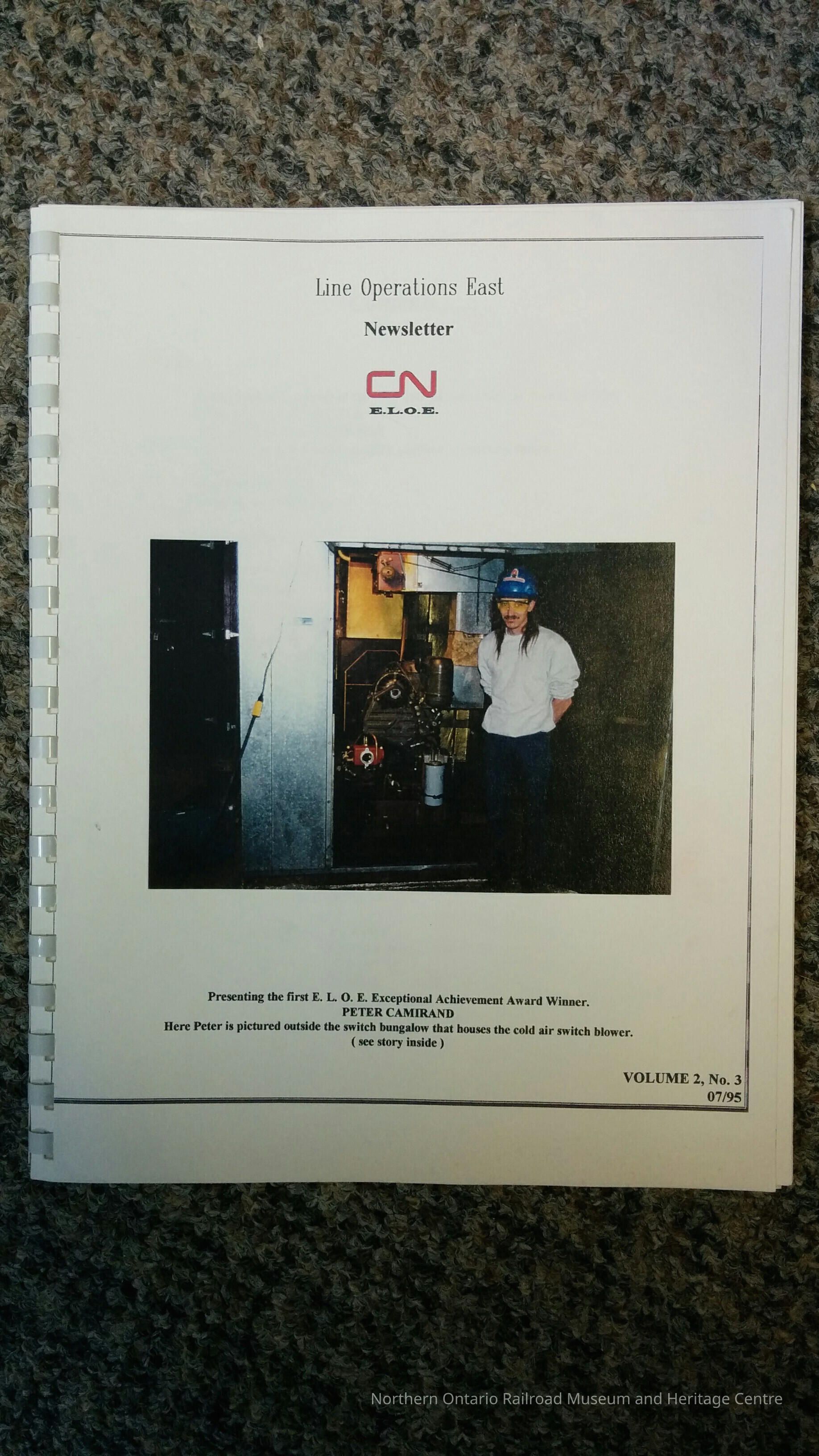 Book, newsletter for Canadian National's line operations east. It was printed in July of 1995 and it highlights all of the accomplishments of the exceptional employees of that year. Its feature stories: Peter Camirand winner of the exceptional achievement award for May, women at work for ELOE, tie gang 341, curve rail gang turning into a gauging gang at a moments notice, a laborer's point of view, walking the other mile.