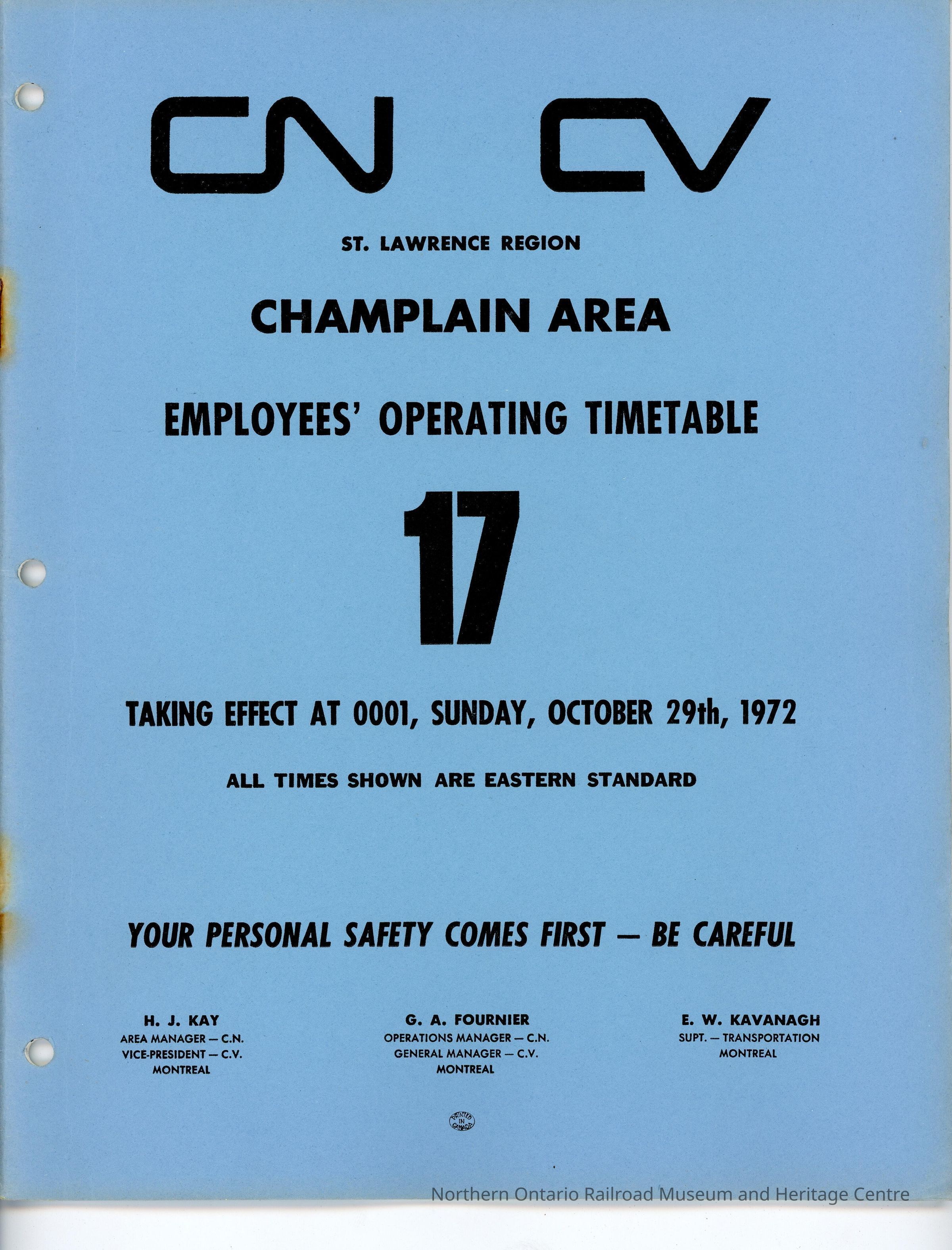 CN Employee Operating Time Table 17 for St. Lawerence Region, Champlain Area, Effective Sunday, October 29th, 1972Description