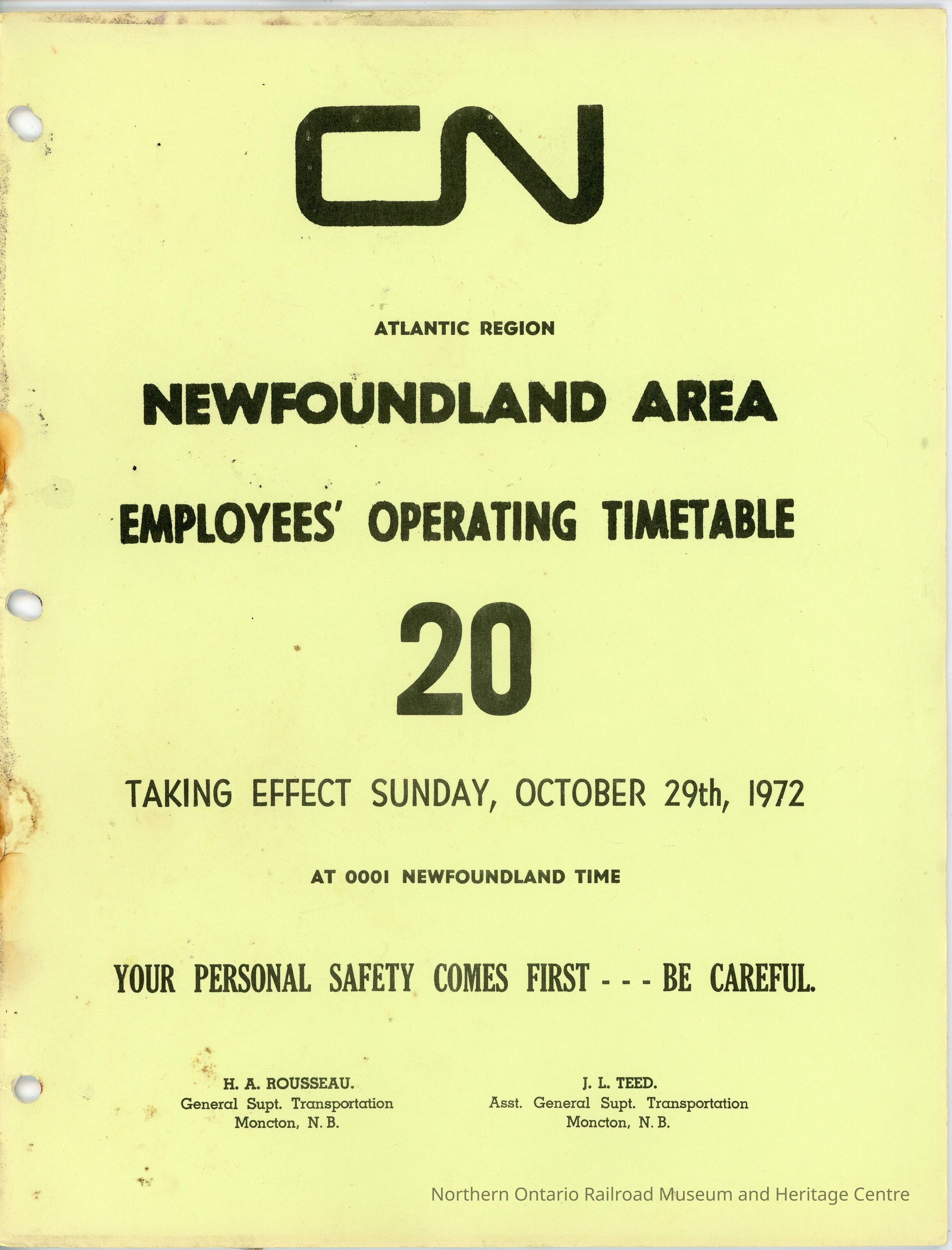 CN Employee Operating Time Table 20 for Atlantic Region, Newfoundland Area, Effective Sunday, October 29th, 1972Collection