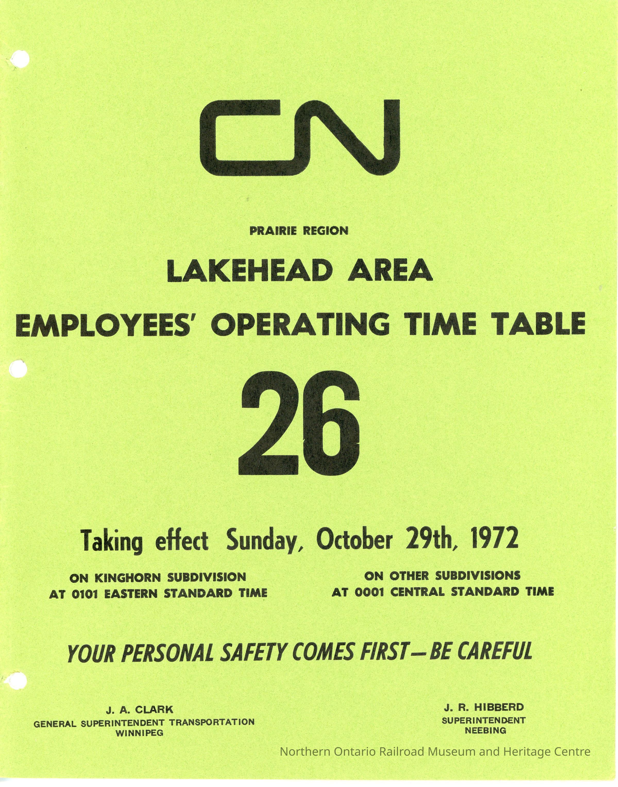 CN Employee Operating Time Table 26 for Prairie Region, Lakehead Area, Effective Sunday, October 29th, 1972Collection