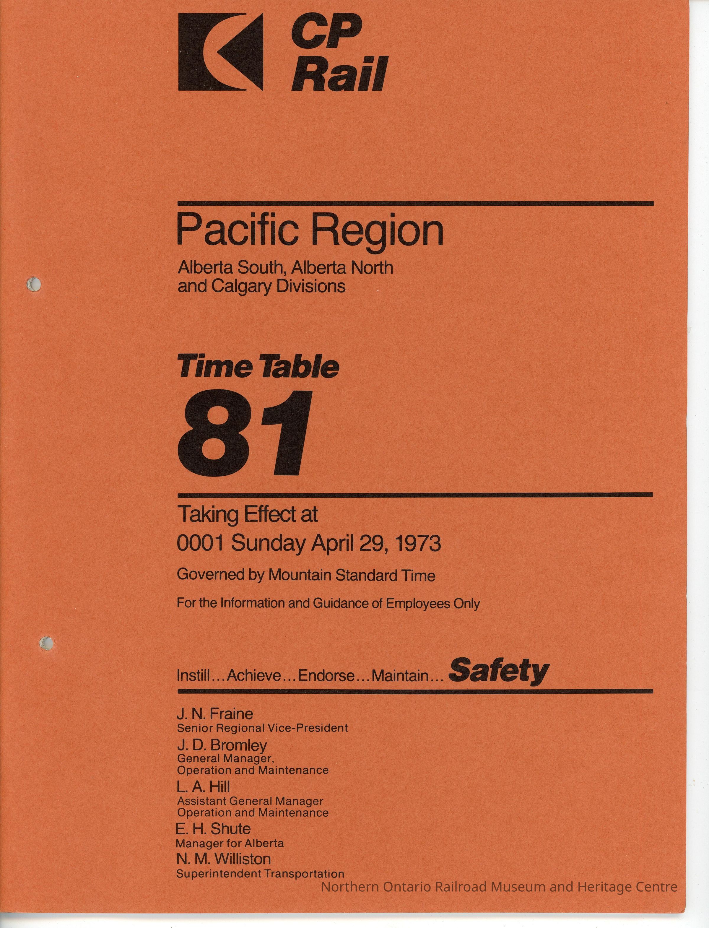 CN Employee Operating Time Table 81 for Pacific Region, Alberta South, Alberta North and Calgary Divisions, Effective Sunday, April 29th, 1973Collection