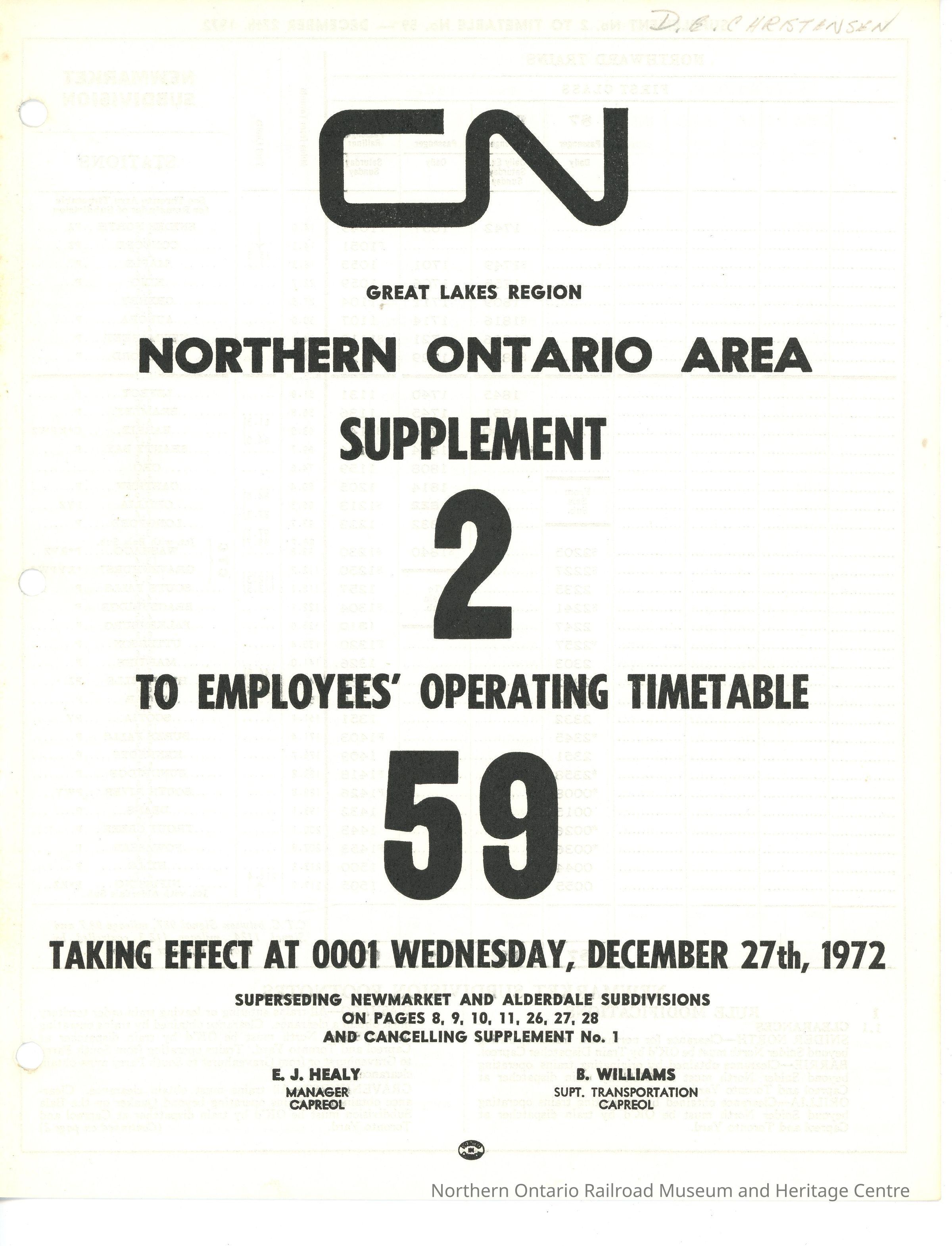 CN Employee Operating Time Table, Supplement 2/2 for Time Table 59 for Pacific Region, Saint John Division, Effective Sunday, December 27, 1972Description