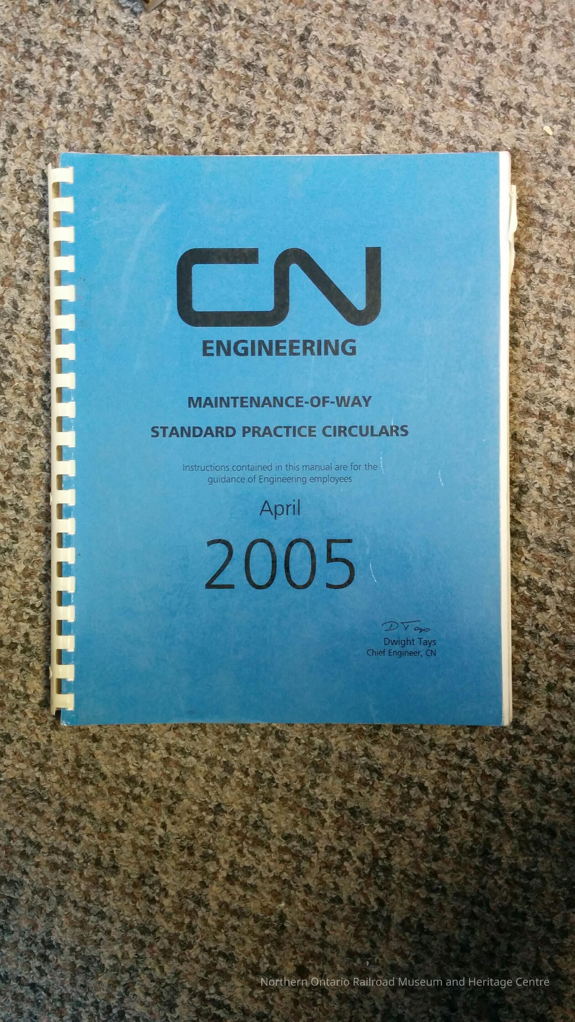 Book, maintenance of way for Canadian National engineering department for standard practice for circulars. Includes: roadbed and right of way, road crossings, testing of crossing warning devices, culverts, track geometry, minimum track construction standards, superelevation and spiral curves, clearances and track spacing, track geometry maintenance standards, rail, classification of rail, field welding of rail, rail wear and rail usage guidelines, jointed rail, continuous welded rail, rail lubrication, rail testing frequency and remedial, action for defective rails, rail grinding with self propelled grinding machines, track, track inspection guidelines, timber track ties, concrete track ties, turnouts, railway crossings at grade, tir plates, rail anchors, joints, derails, rail fastening, ballasting surfacing and lining, application of granular salt, bridges and structures, standard maintenance of timber open decks, standard maintenance for timber bridges, guard rails and guard timbers, miscellaneous, signal systems precautions.