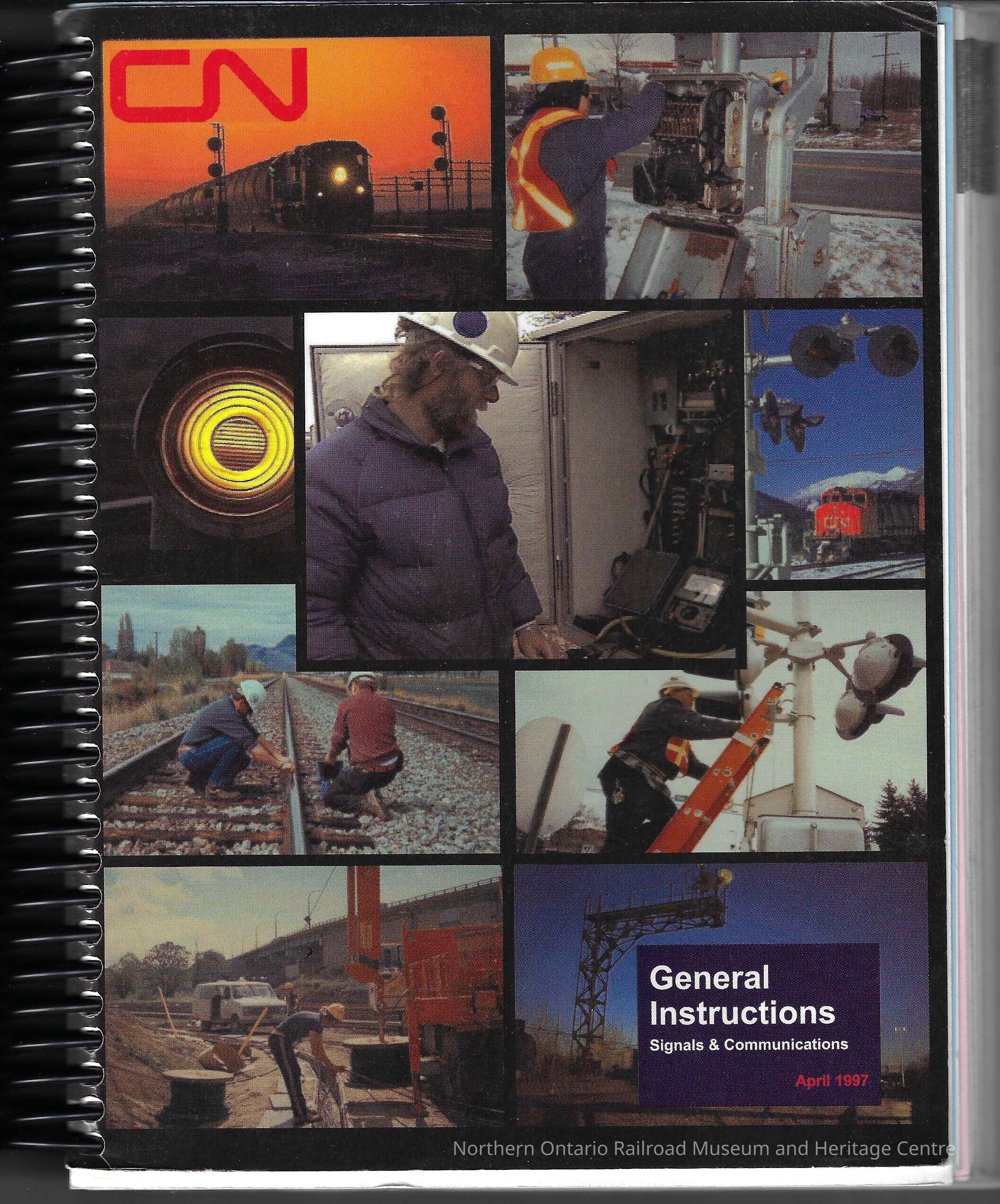 Book, manual for general instructions in regards to signals and communications for Canadian National. Includes: instruction, working with approved plans, testing signal circuits and apparatus, recording circuit wiring and design errors, performing vital circuit revisions, signal installation and testing documentation, updating as installed plans, inspecting and testing vital tools and test instruments, inspecting and test intervals, protecting train operations during signal system interruption, replacing and tagging defective in-service apparatus, recording inspecting and test results, reporting inspection and test results, inspecting and testing apparatus- unspecific, relief from performing inspections and tests, observance of rules standards and instructions, investigating signal related incidents failures and interruptions, inspecting cable housings, testing for circuit grounds and battery isolation faults, inspecting and testing primary batteries, inspecting and testing storage batteries, inspecting and testing wayside pushbuttons and panels, inspecting and testing recording devices, inspecting and testing electric locks, testing ground resistance, testing highway grade crossing warning devices, testing wire and cable installation, inspecting lighting arresters, inspecting signal poleline and attachments, testing approach locking, inspecting and testing movable bridge locking, testing route and detector locking, testing time locking, testing traffic locking and blocking, inspecting and testing search light signal mechanisms, inspecting and testing relays, seals on electric locks, fouling circuits, circuit controllers, power switch machines, spring switches, timing relay, track appliances, track circuits,