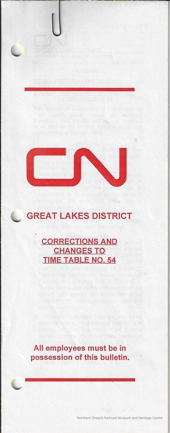 CN Great lakes District Corrections and Changes to Time Table No. 54Entry/Object ID