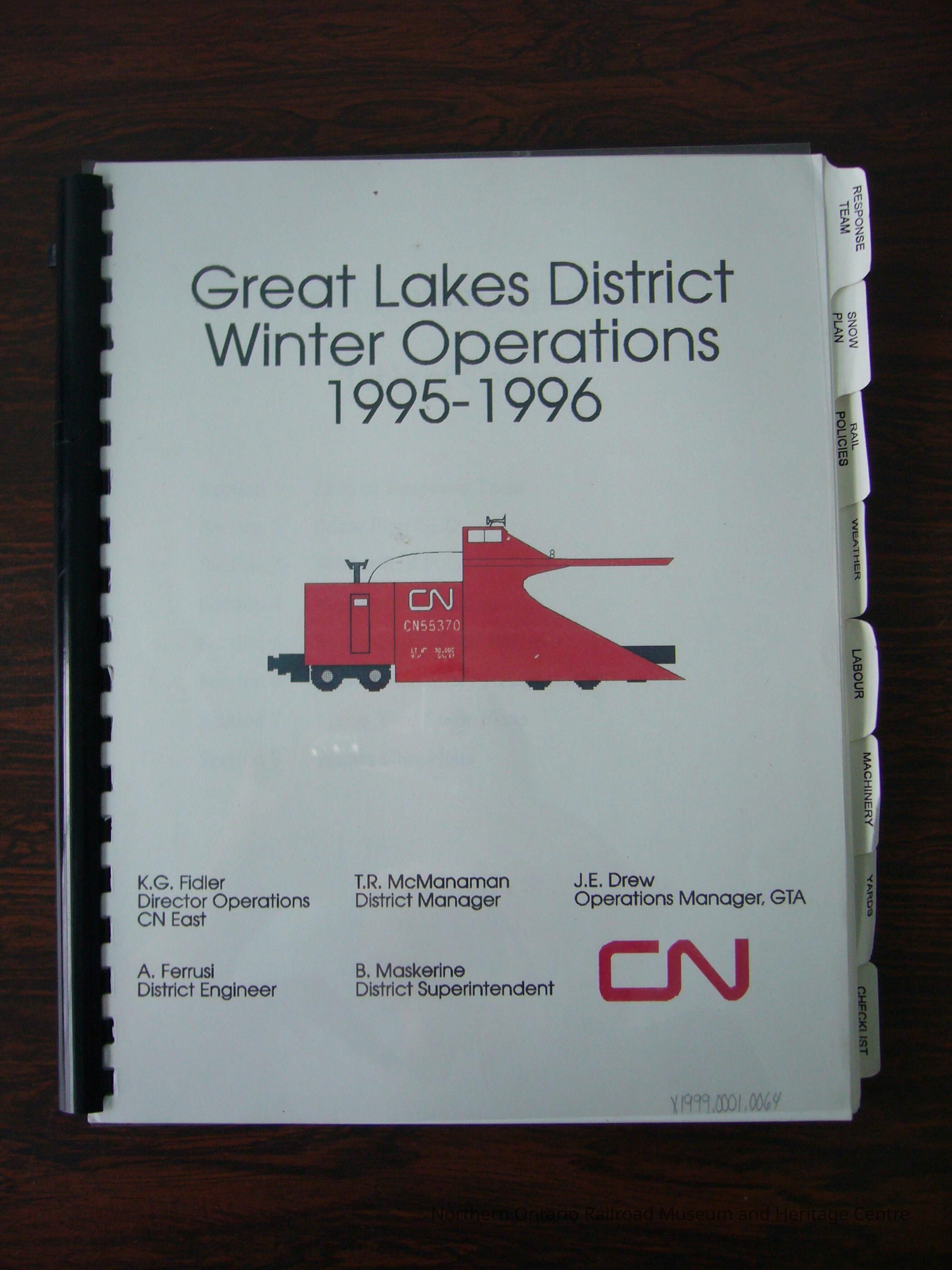 CN Great Lakes District Winter Operations 1995-1996. Winter preparedness manual including district response team, snow plan, winter rail policies, weather forecasting, temporary labour forces, winter machinery assignments, major yard snow plans, winter checklists.Collection