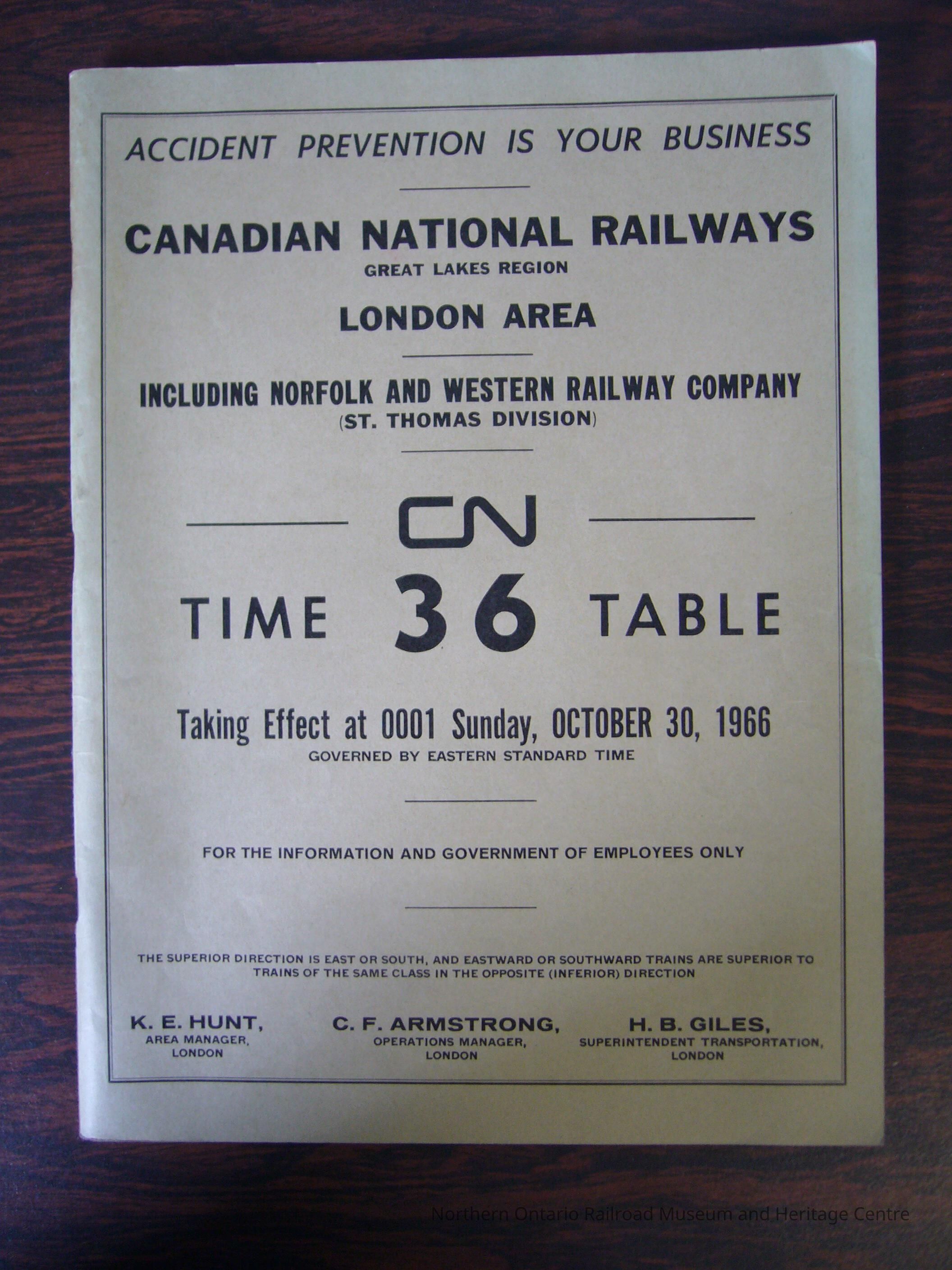 CN Great Lakes London Area Including Norfolk and Western Railway Company (St. Thomas Division) Time Table 36, Taking Effect at 0001 Sunday, October 30, 1966Description
