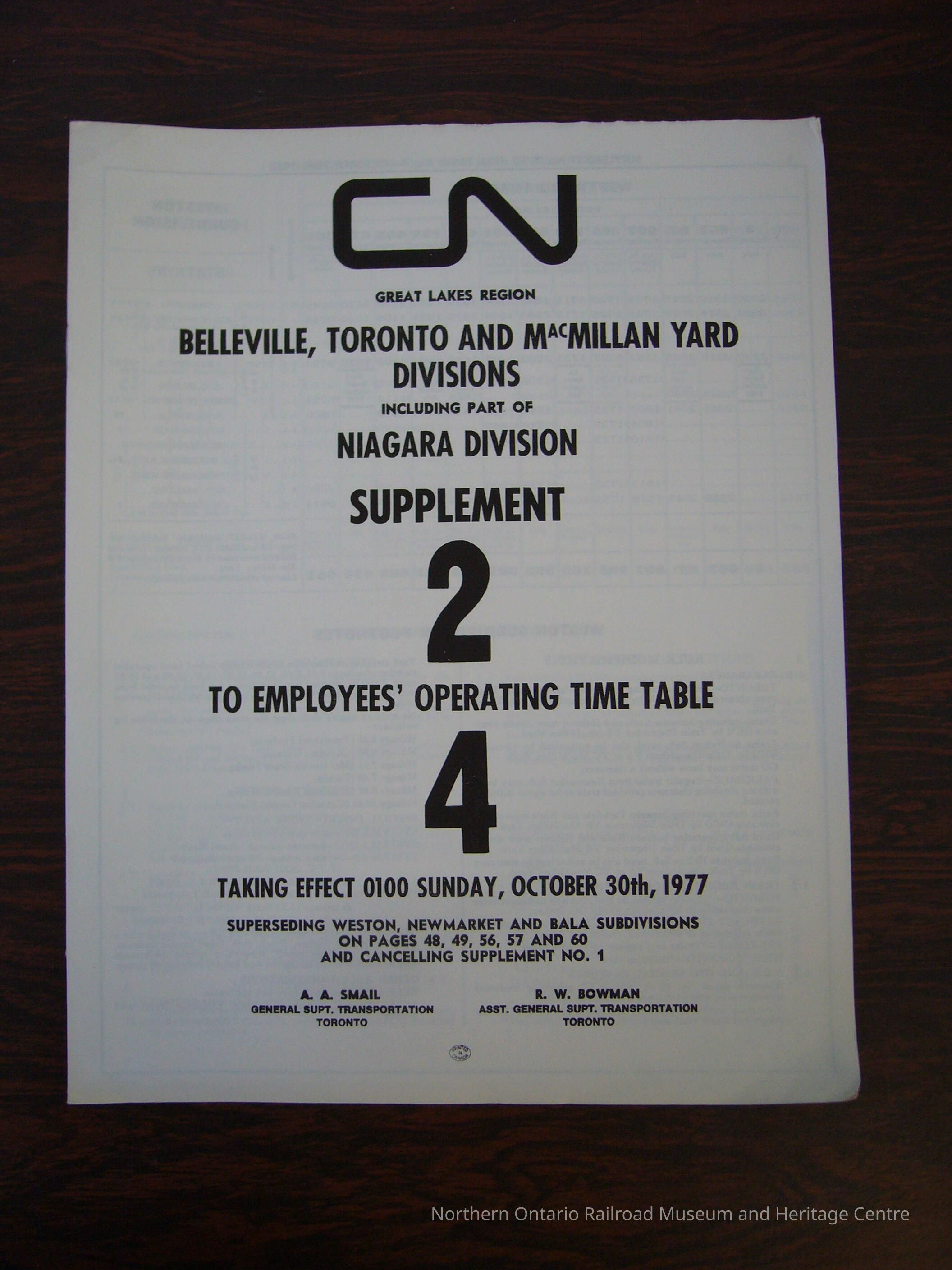 CN Great Lakes Region Belleville, Toronto and MacMillan Yard Divisions, including part of Niagara Division, Supplement 2 to Employees' Operating Time Table 4, Taking Effect Sunday, October 30th, 1977.Collection