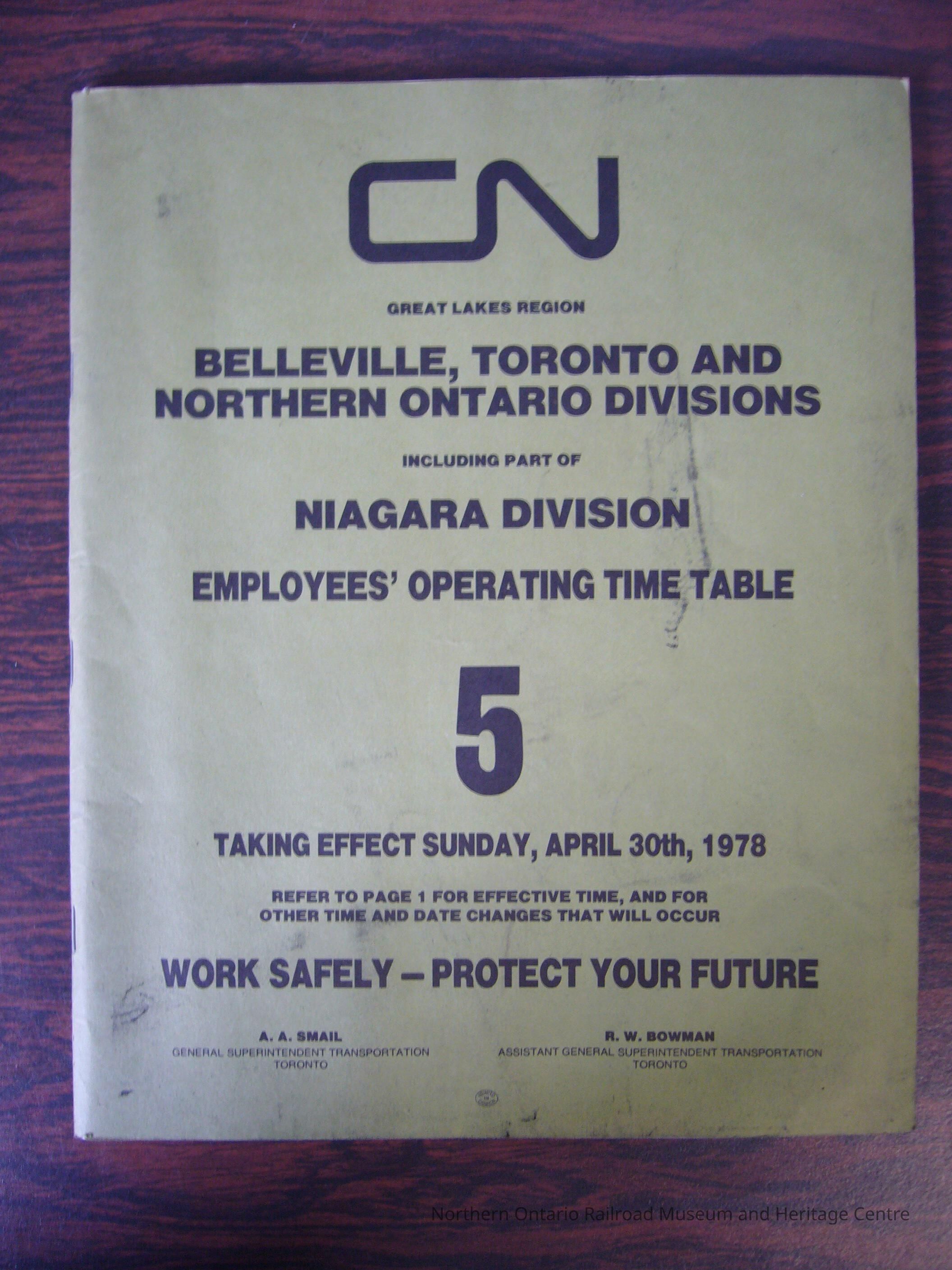 CN Great Lakes Region Belleville, Toronto and Northern Ontario Divisions Including Part of Niagara Division Employees' Operating Time Table 5, Taking Effect Sunday, April 30th, 1978.Collection