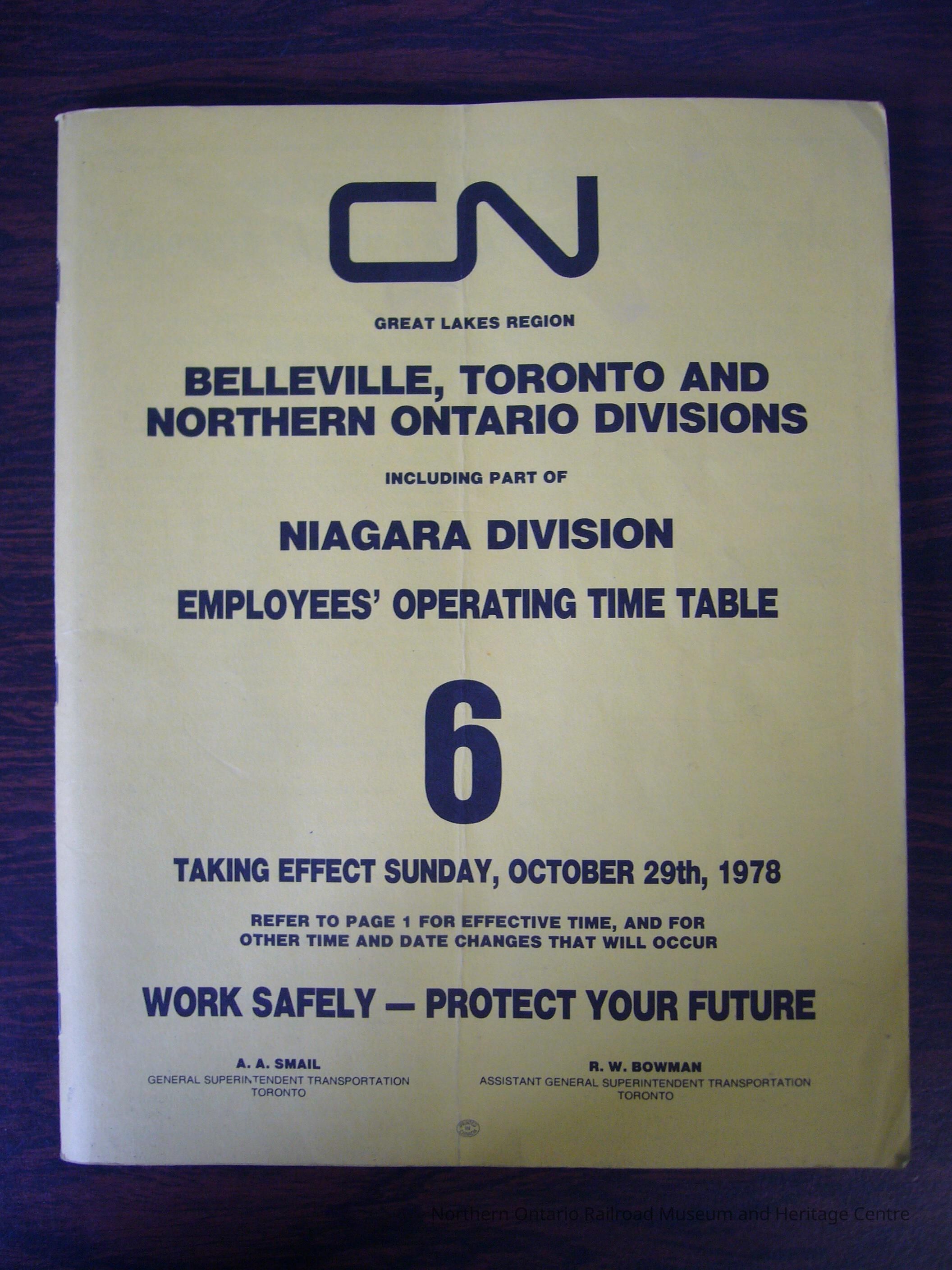 CN Great Lakes Region Belleville, Toronto and Northern Ontario Divisions Including Part of Niagara Division Employees' Operating Time Table 6, Taking Effect Sunday, October 29th, 1978Description