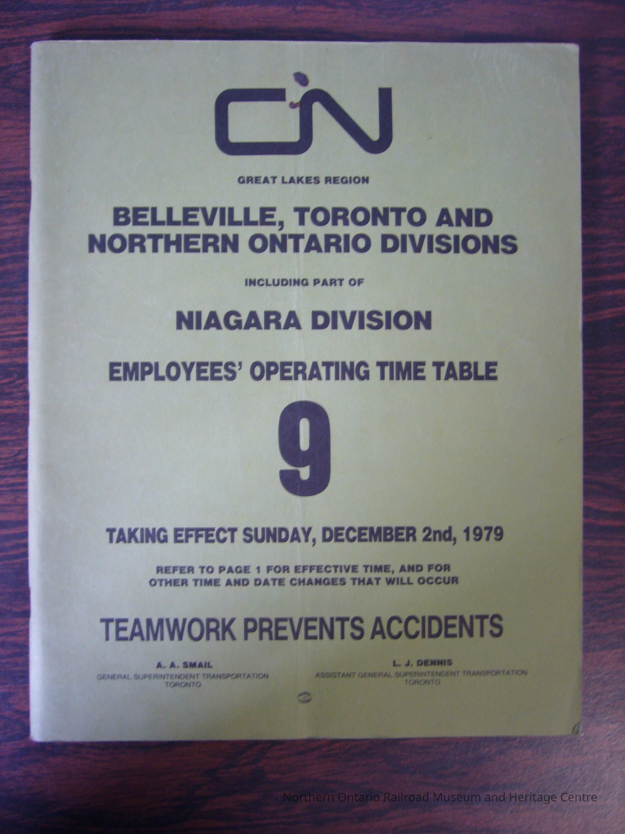 CN Great Lakes Region Belleville, Toronto and Northern Ontario Divisions Including Part of Niagara Division Employees' Operating Time Table 9, Taking Effect Sunday, December 2nd, 1979Collection