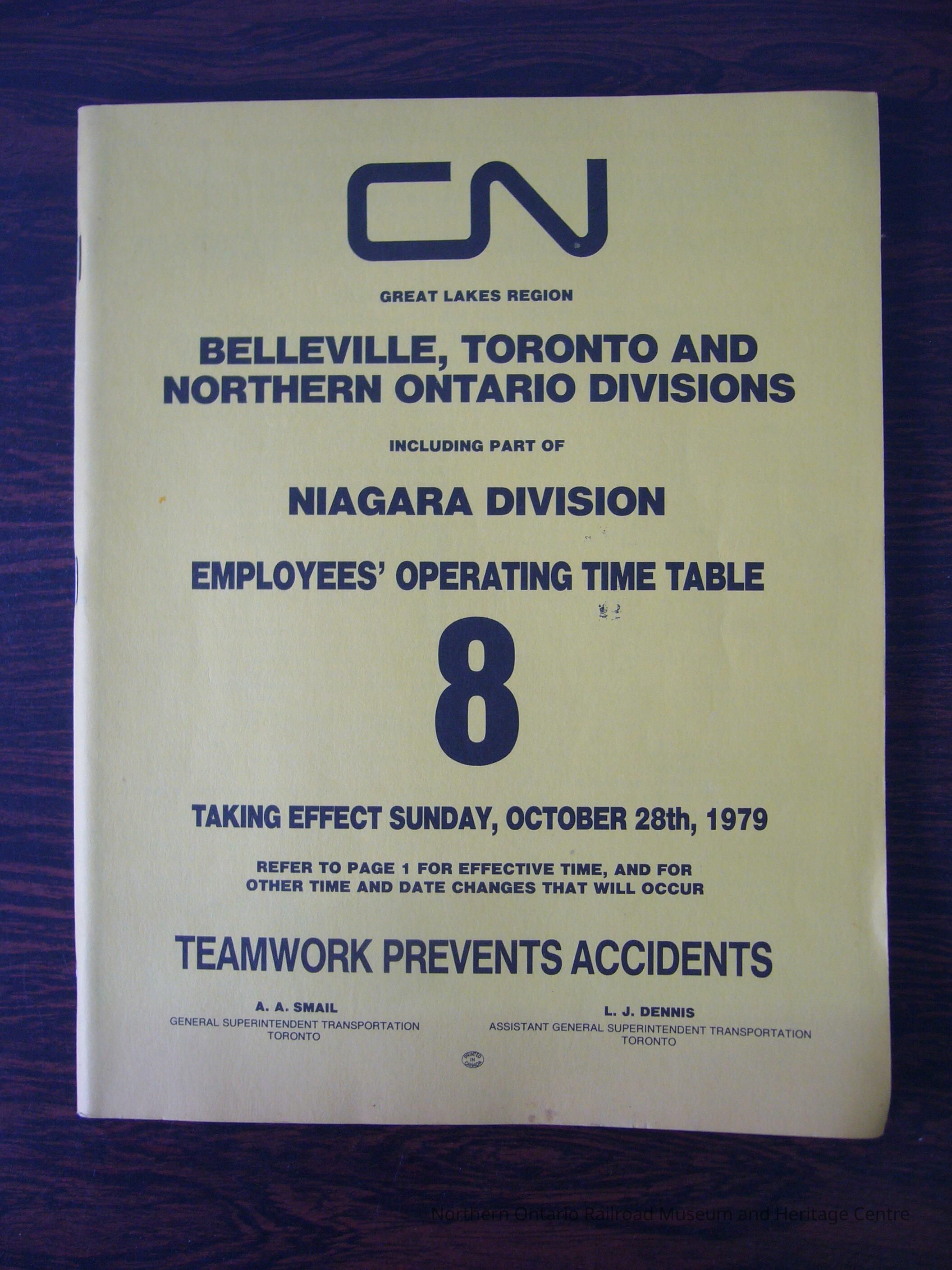 CN Great Lakes Region, Belleville, Toronto and Northern Ontario Divisions including part of Niagara Division, Employees' Operating Time Table No. 8, Taking Effect Sunday, October 28th, 1979Description