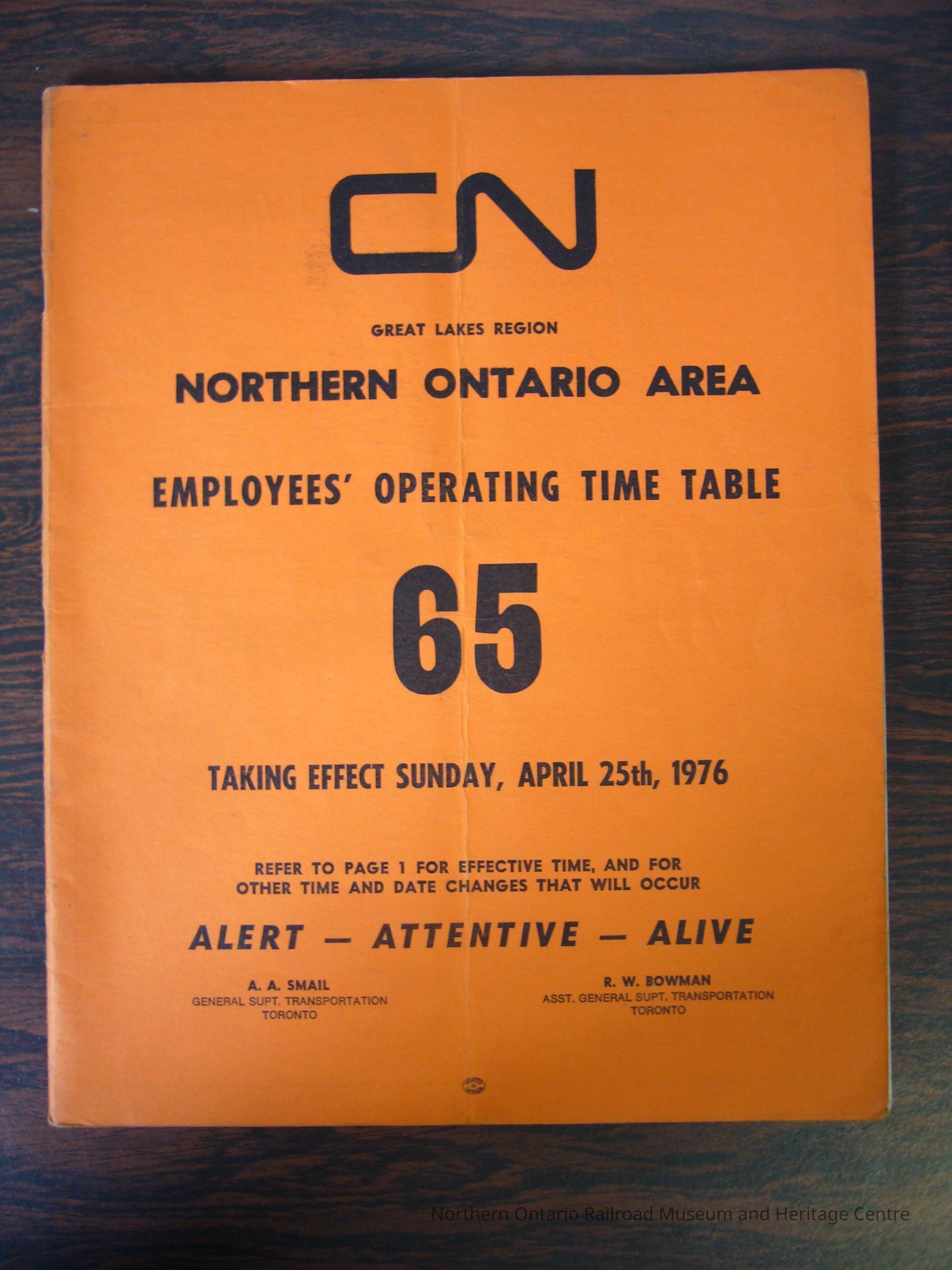 CN Great Lakes Region Northern Ontario Area Employees' Operating Time Table 65, Taking Effect Sunday, April 25th, 1976Entry/Object ID