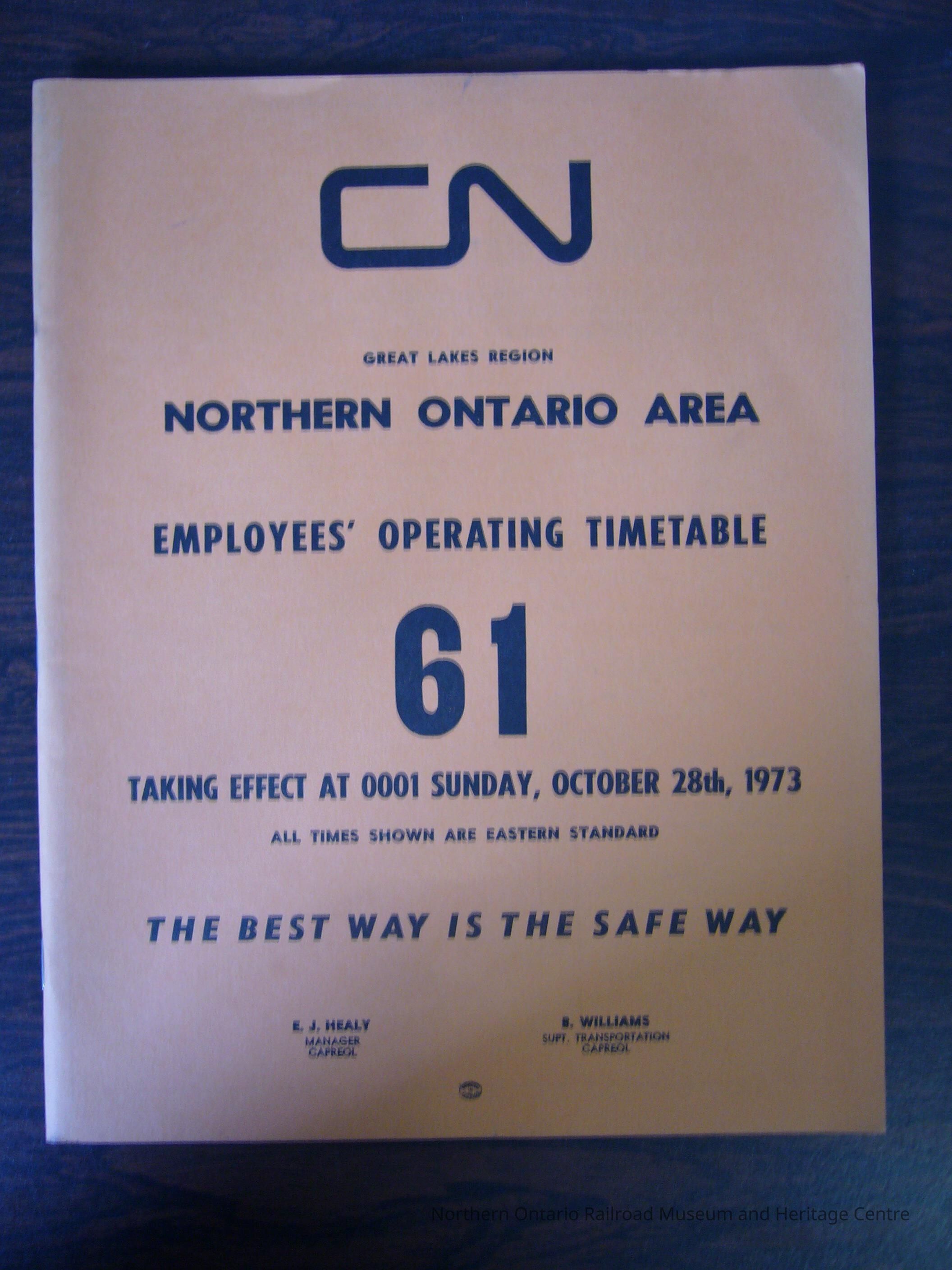 CN Great Lakes Region Northern Ontario Area Employees' Operating Timetable 61, Taking Effect at 0001 Sunday, October 28th, 1973Description