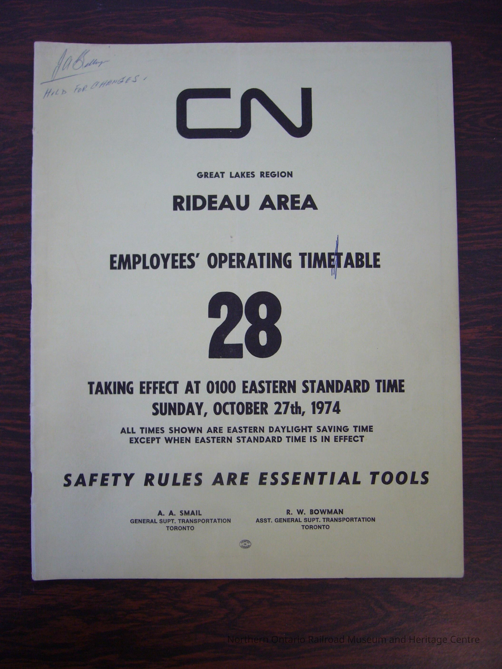 CN Great Lakes Region Rideau Area Employees' Operating Time Table 28, Taking Effect Sunday, October 27th, 1974.Collection