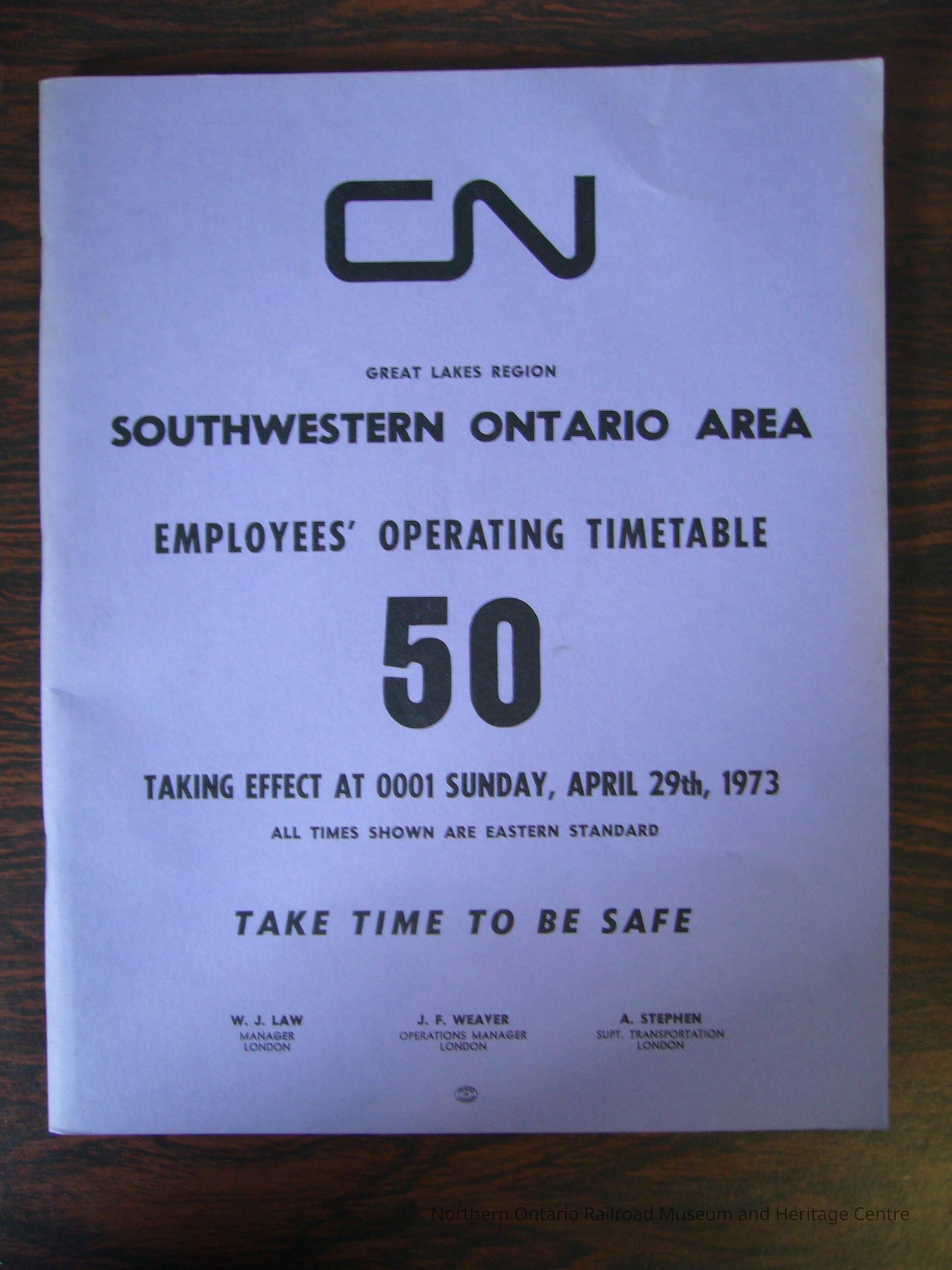 CN Great Lakes Region Southwestern Ontario Area Employees' Operating Timetable 50, Taking Effect at 0001 Sunday, April 29th, 1973Collection