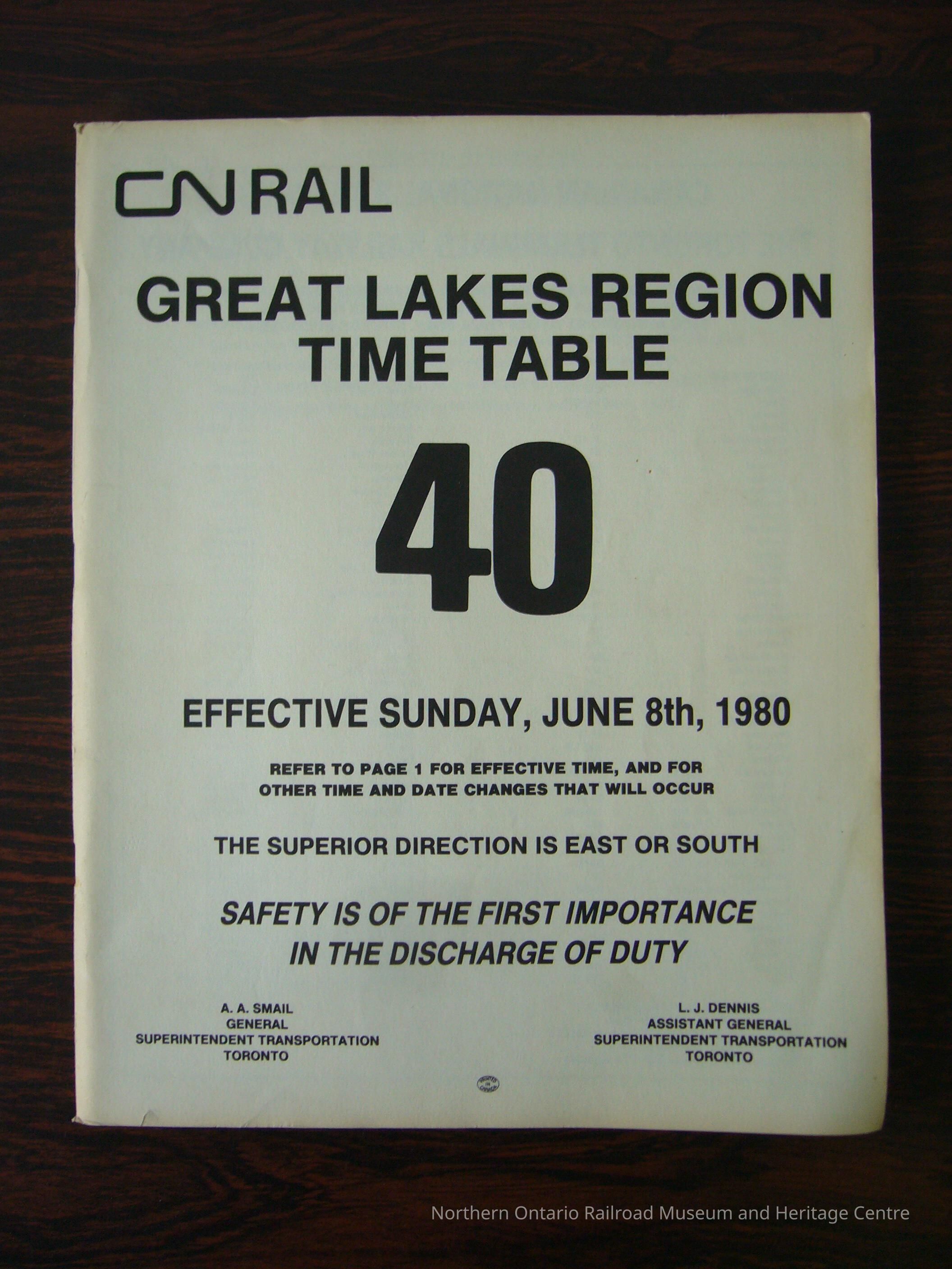 CN Great Lakes Region Time Table No. 40, Effective Sunday, June 8th, 1980Description