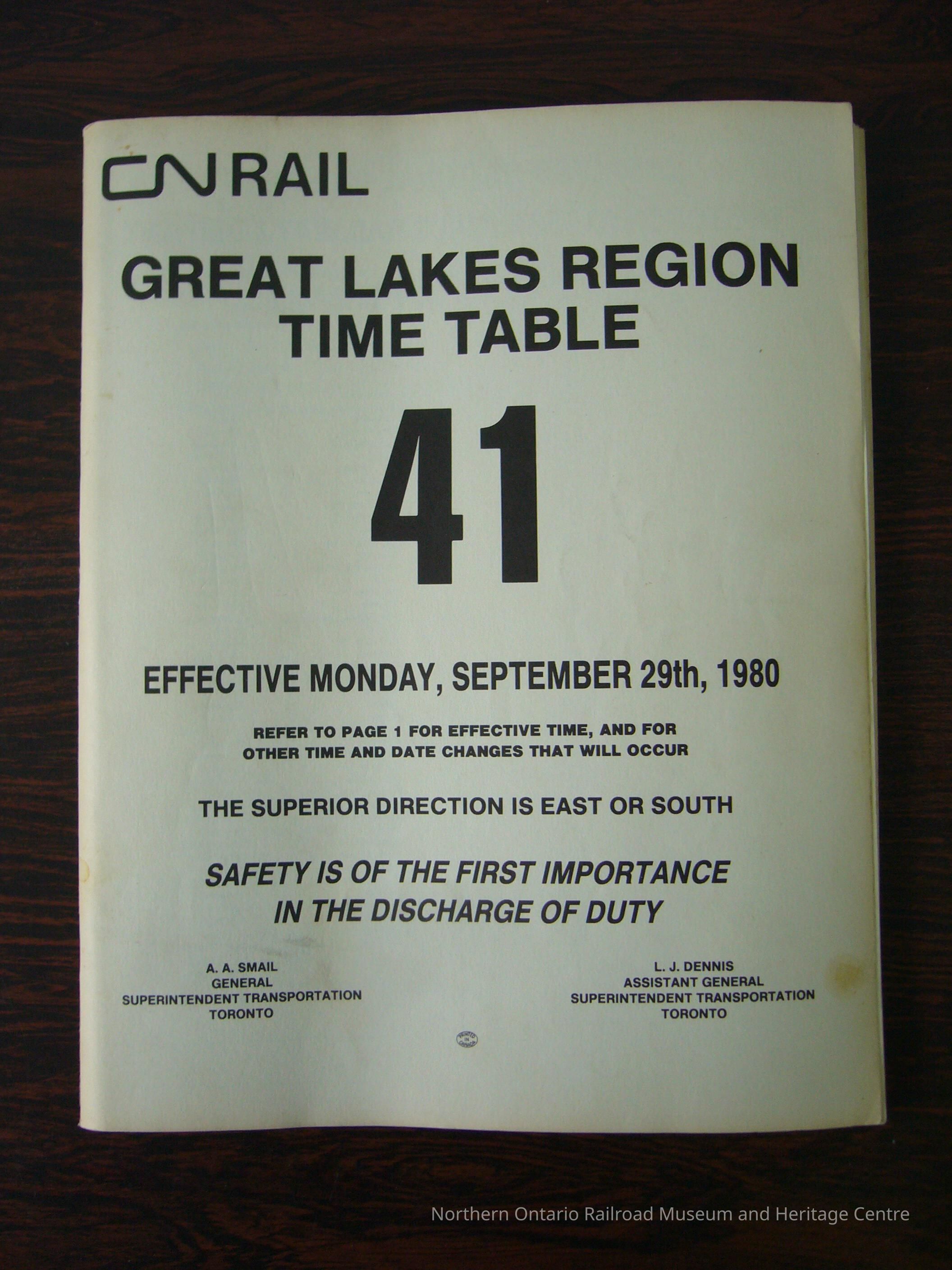 CN Great Lakes Region Time Table No. 41, Effective Monday, September 29th, 1980Description