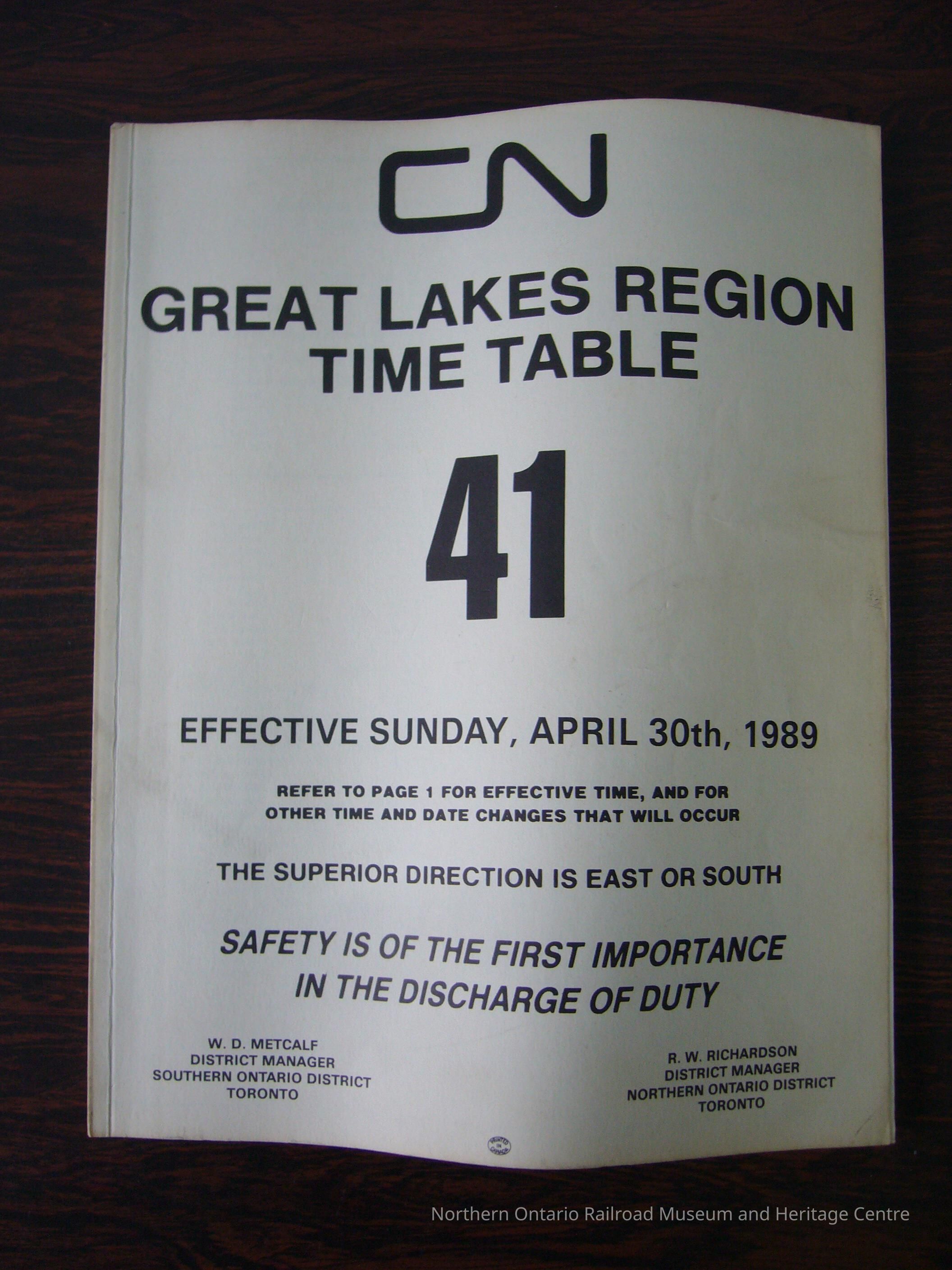 CN Great Lakes Region Time Table No. 41, Effective Sunday, April 30th, 1989Description