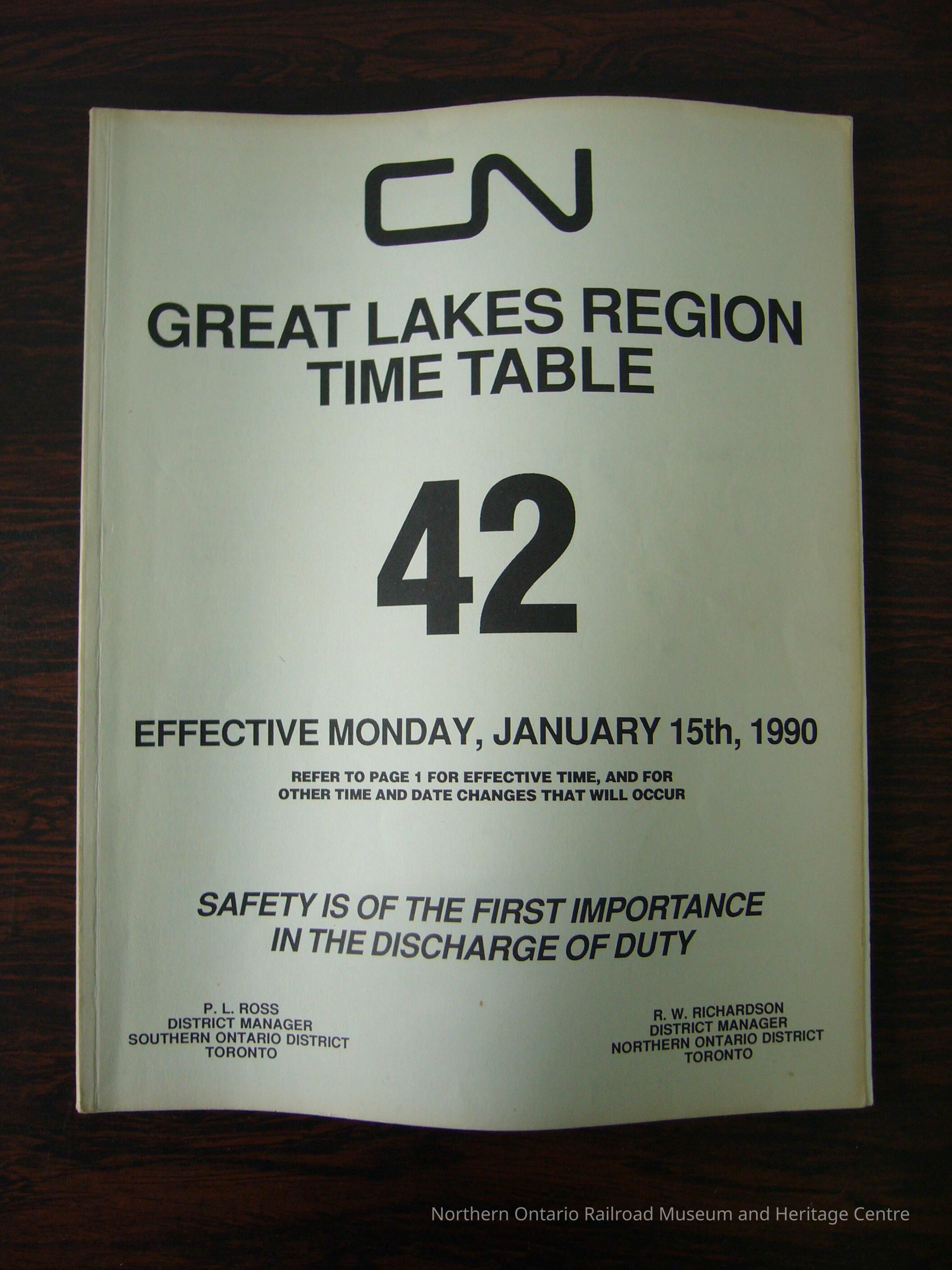 CN Great Lakes Region Time Table No. 42, Effective Monday, January 15th, 1990Collection