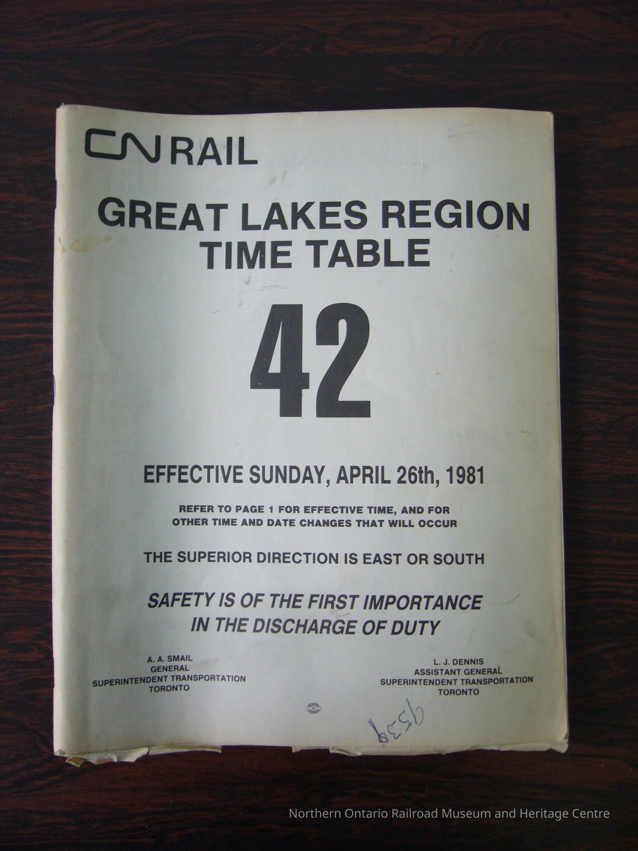 CN Great Lakes Region Time Table No. 42, Effective Sunday, April 26th, 1981Description