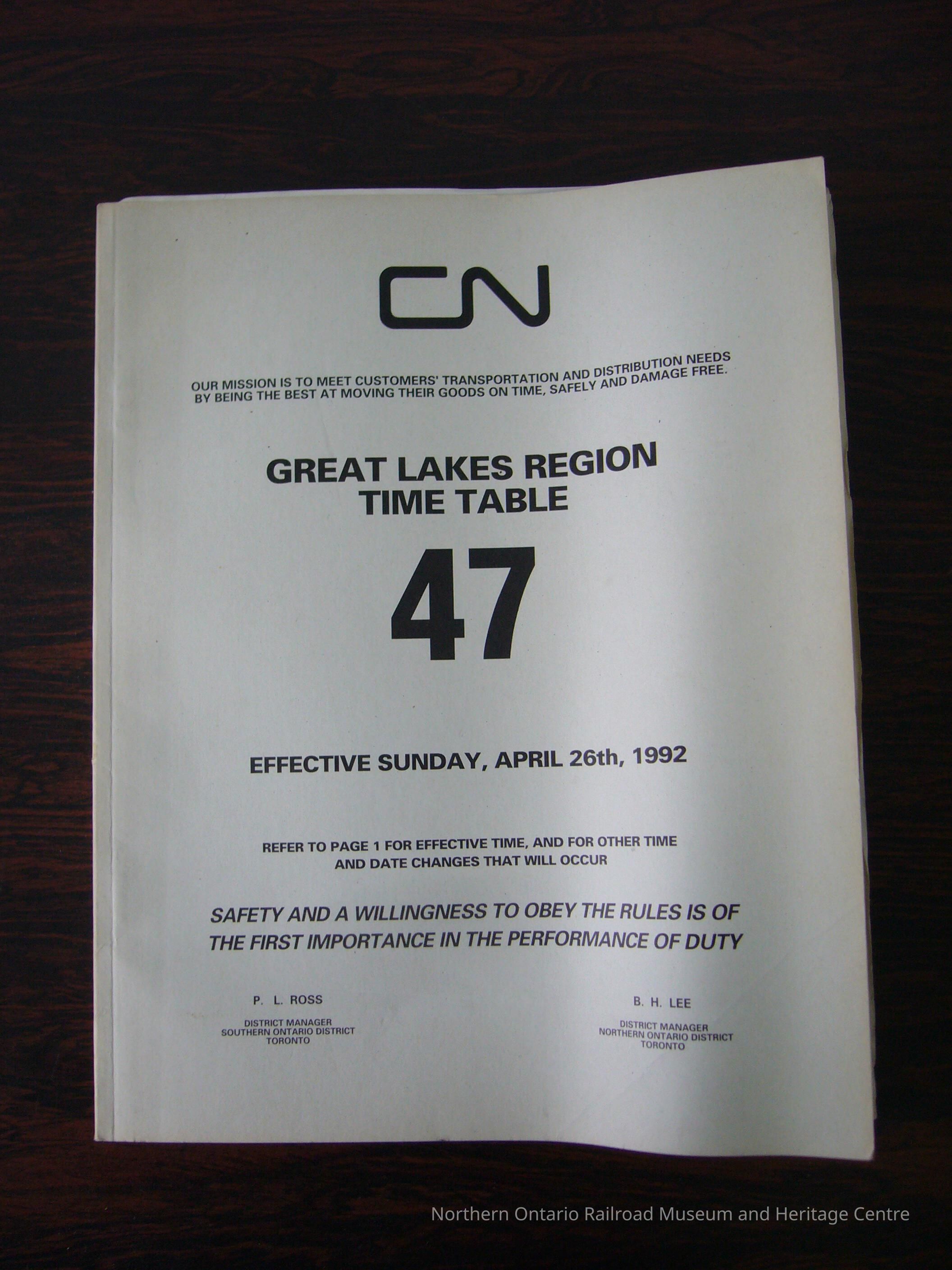 CN Great Lakes Region Time Table No. 47, Effective Sunday, April 26th, 1992Entry/Object ID