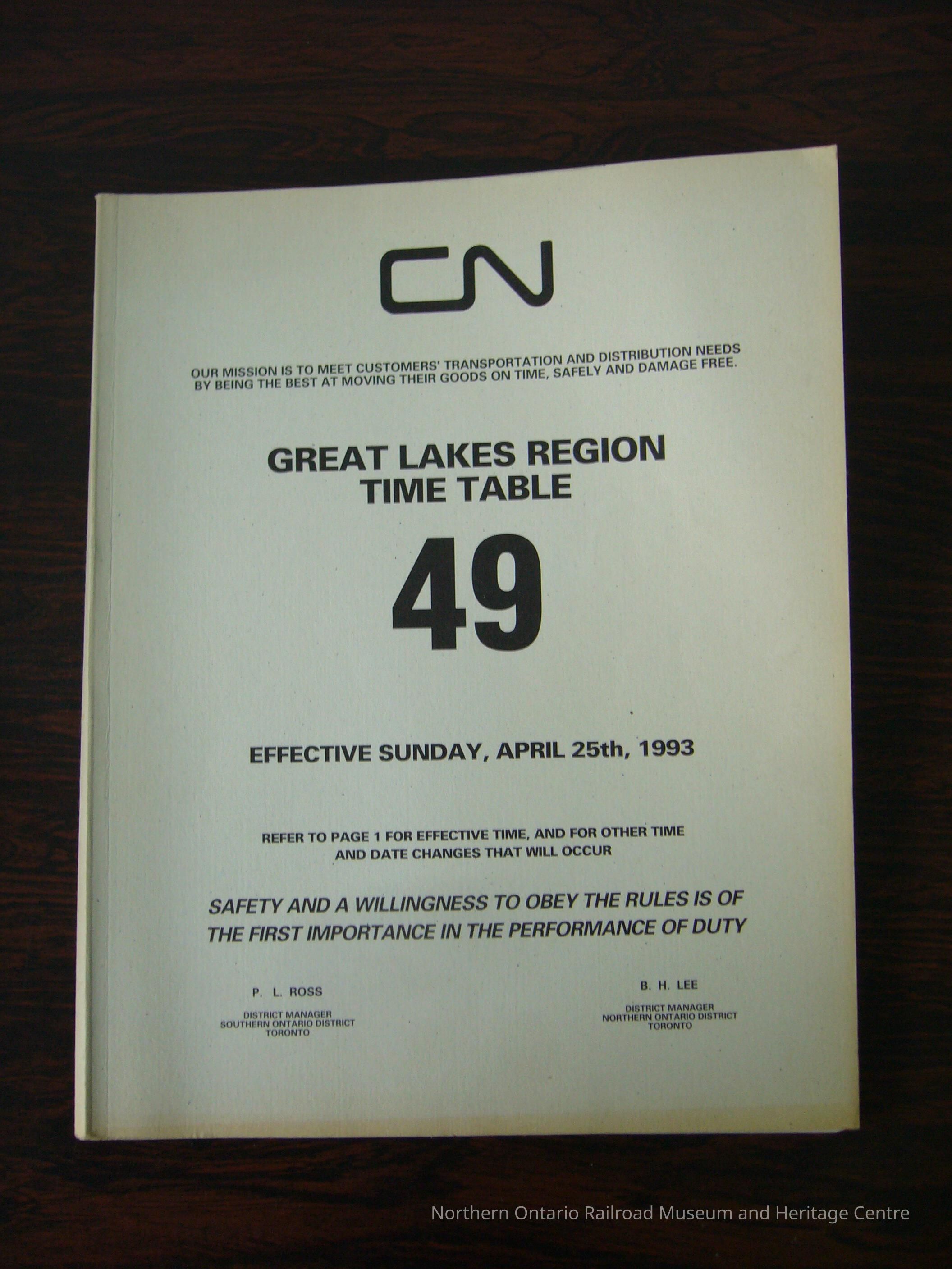 CN Great Lakes Region Time Table No. 49, Effective Sunday, April 25th, 1993Description