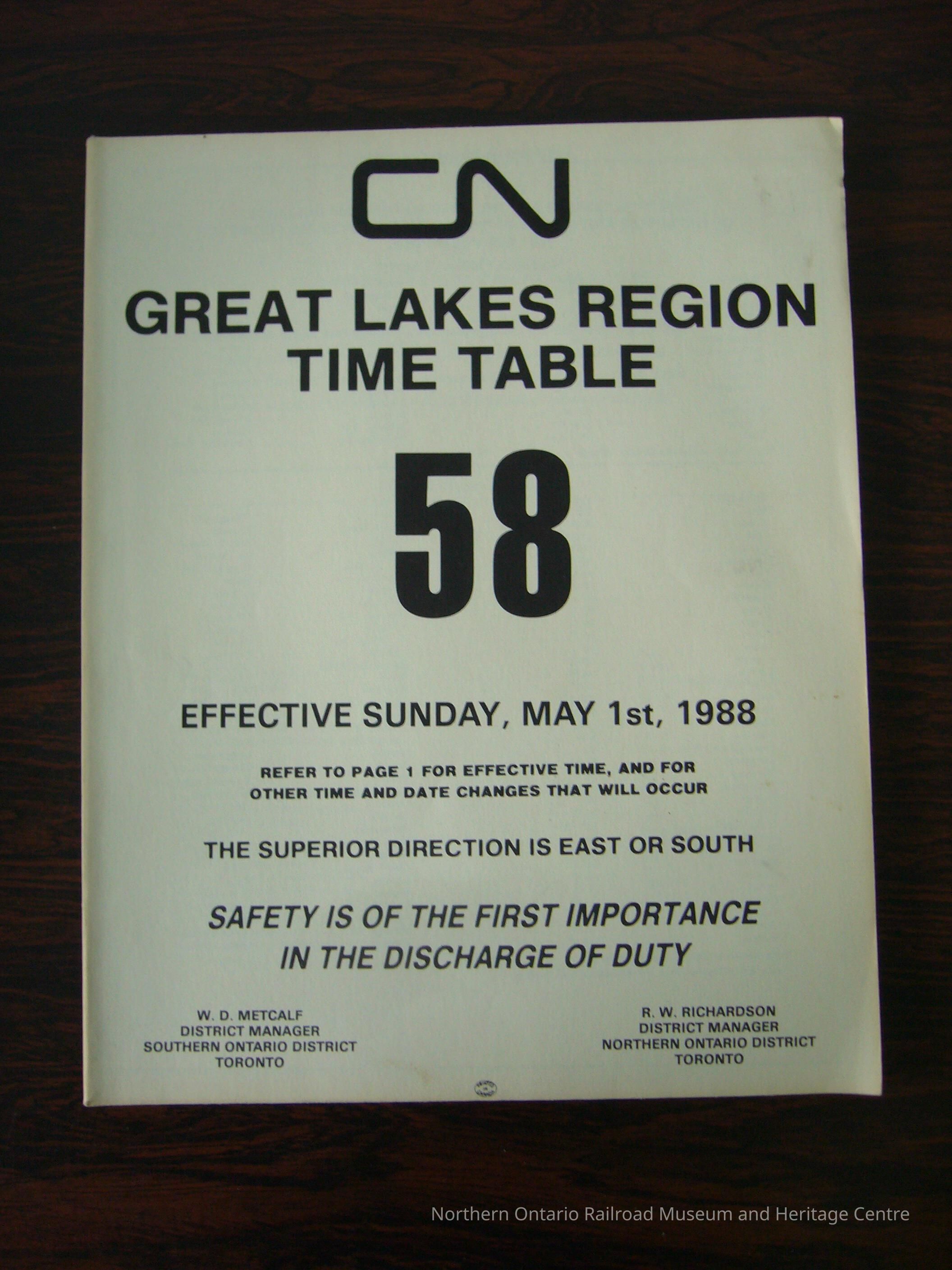 CN Great Lakes Region Time Table No. 58, Effective Sunday, May 1st, 1988Description