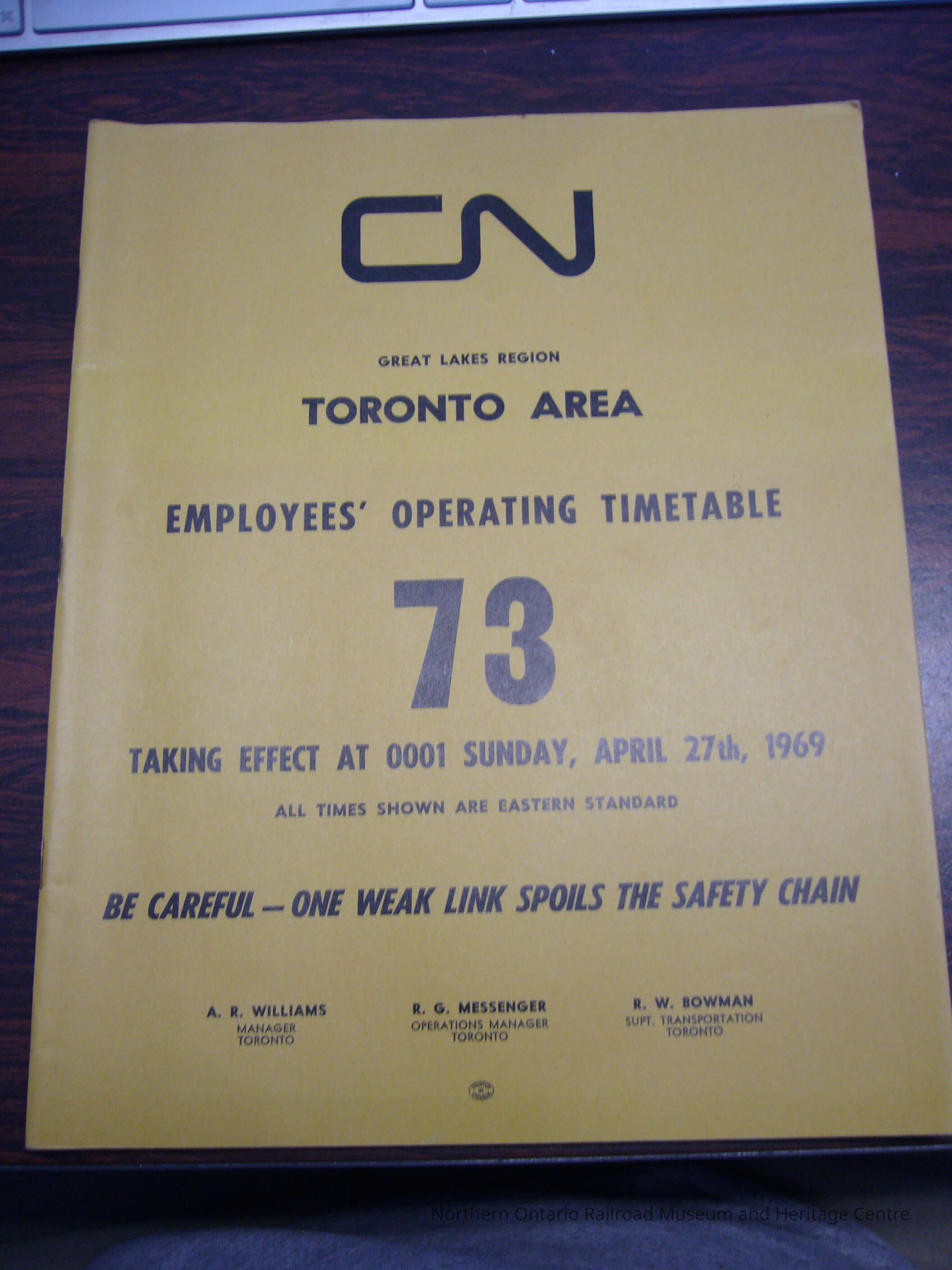 CN Great Lakes Region Toronto Area Employees' Operating Timetable 73. April 27th 1969.Entry/Object ID