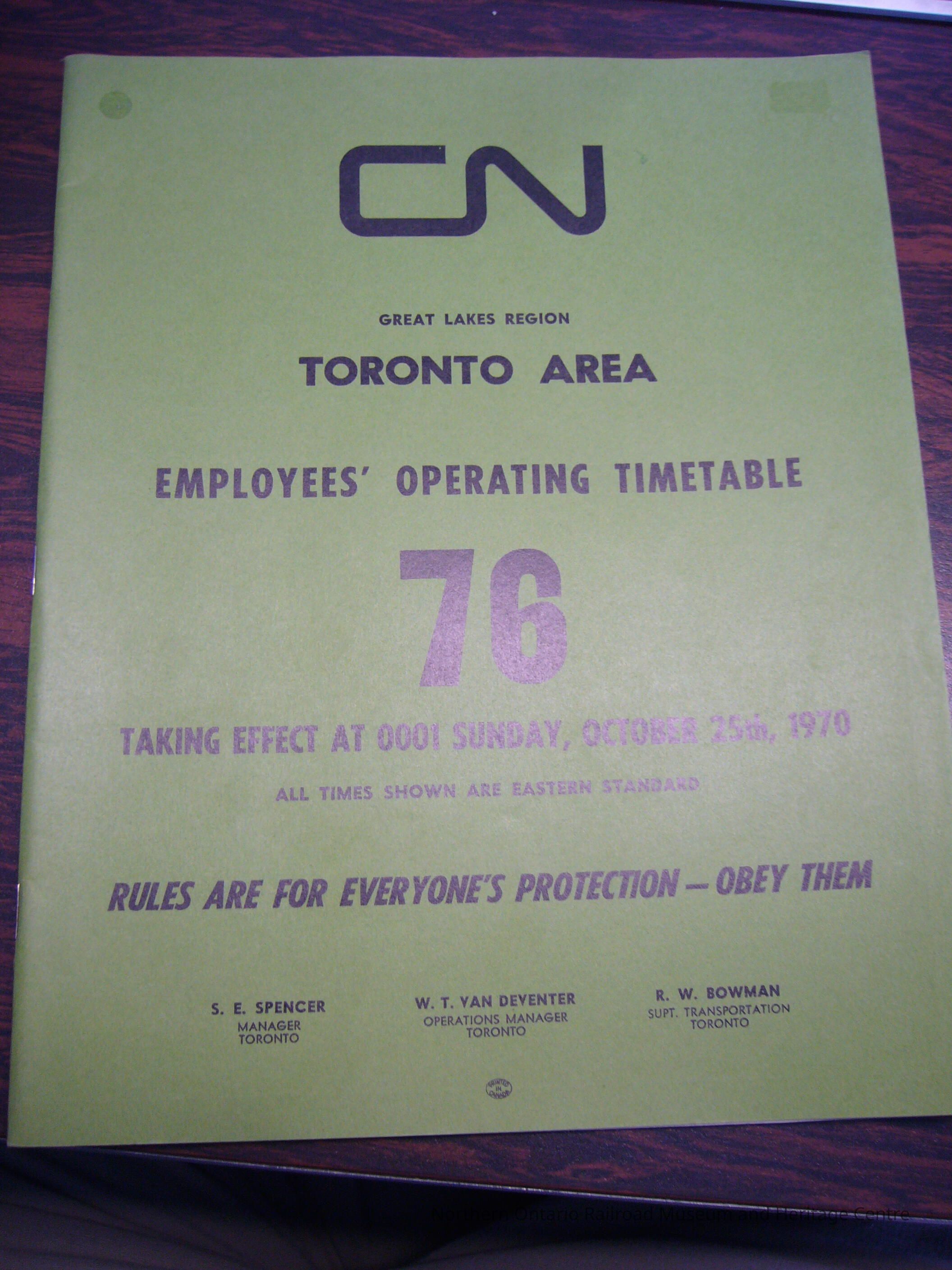 CN Great Lakes Region Toronto Area Employees' Operating Timetable 76. October 25th 1970Entry/Object ID