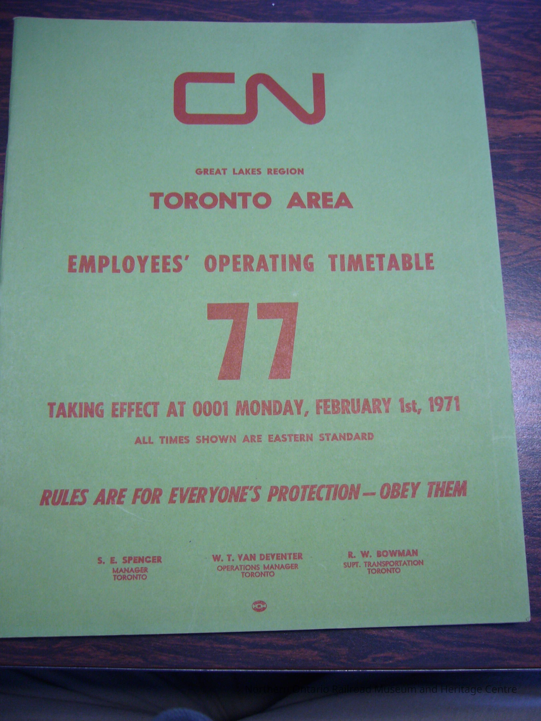 CN Great Lakes Region Toronto Area Employees' Operating Timetable 77. Febraury 1st 1971.Entry/Object ID