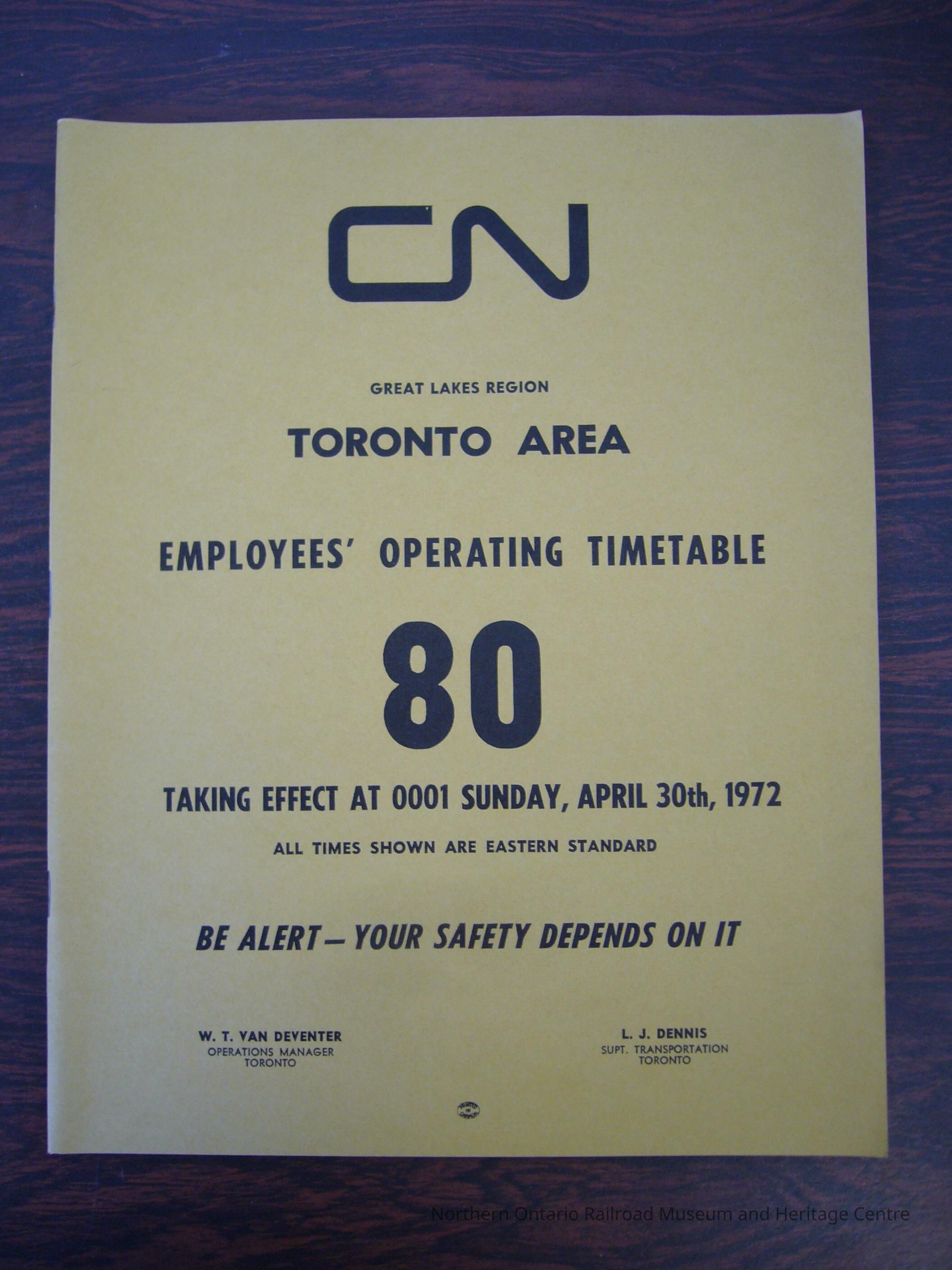 CN Great Lakes Region Toronto Area Employees' Operating Timetable 80, Taking Effect Sunday, April 30th, 1972.Collection