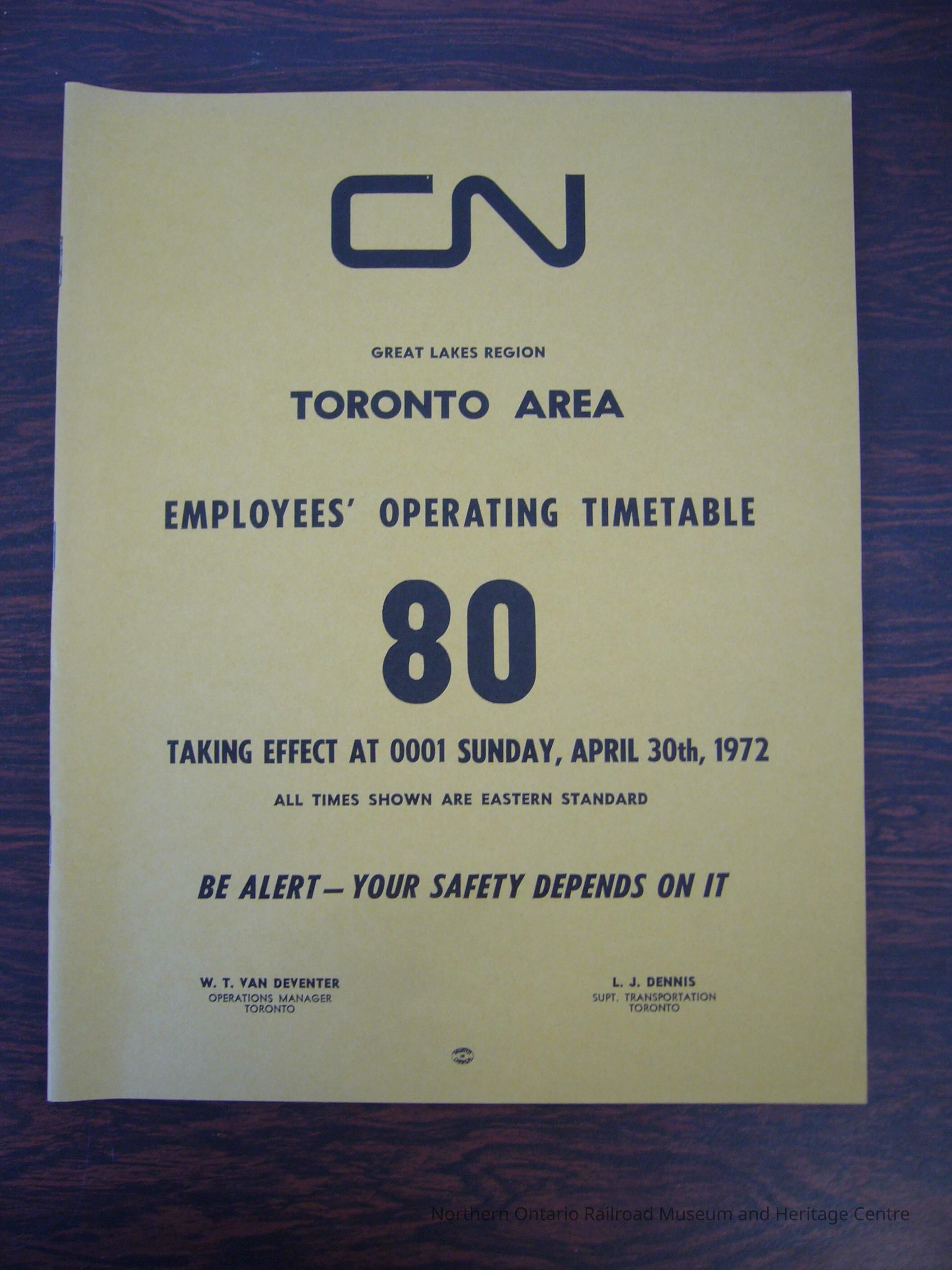 CN Great Lakes Region Toronto Area Employees' Operating Timetable 80, Taking Effect Sunday, April 30th, 1972.Collection
