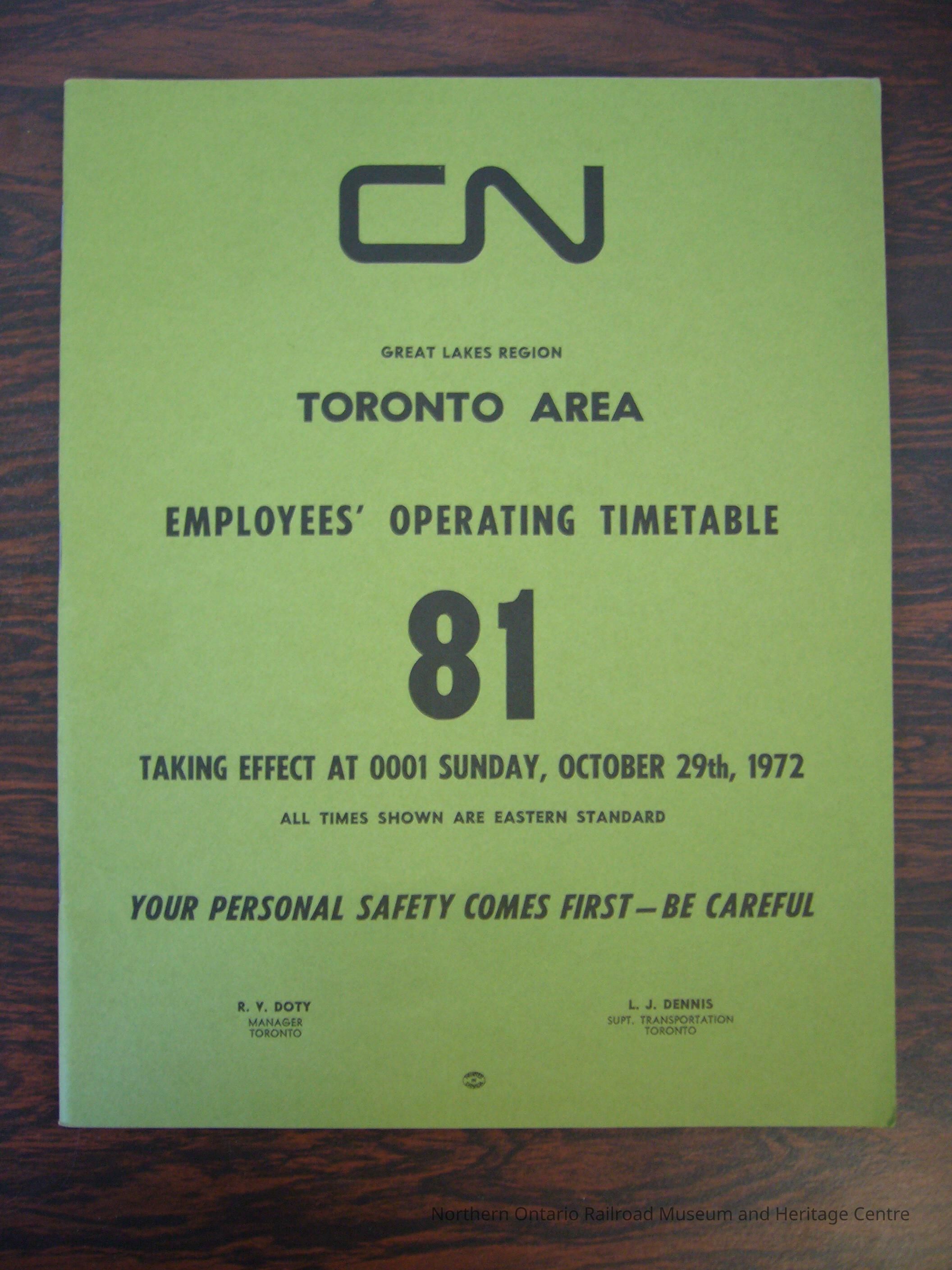 CN Great Lakes Region Toronto Area Employees' Operating Timetable 81, Taking Effect Sunday, October 29th, 1972.Collection