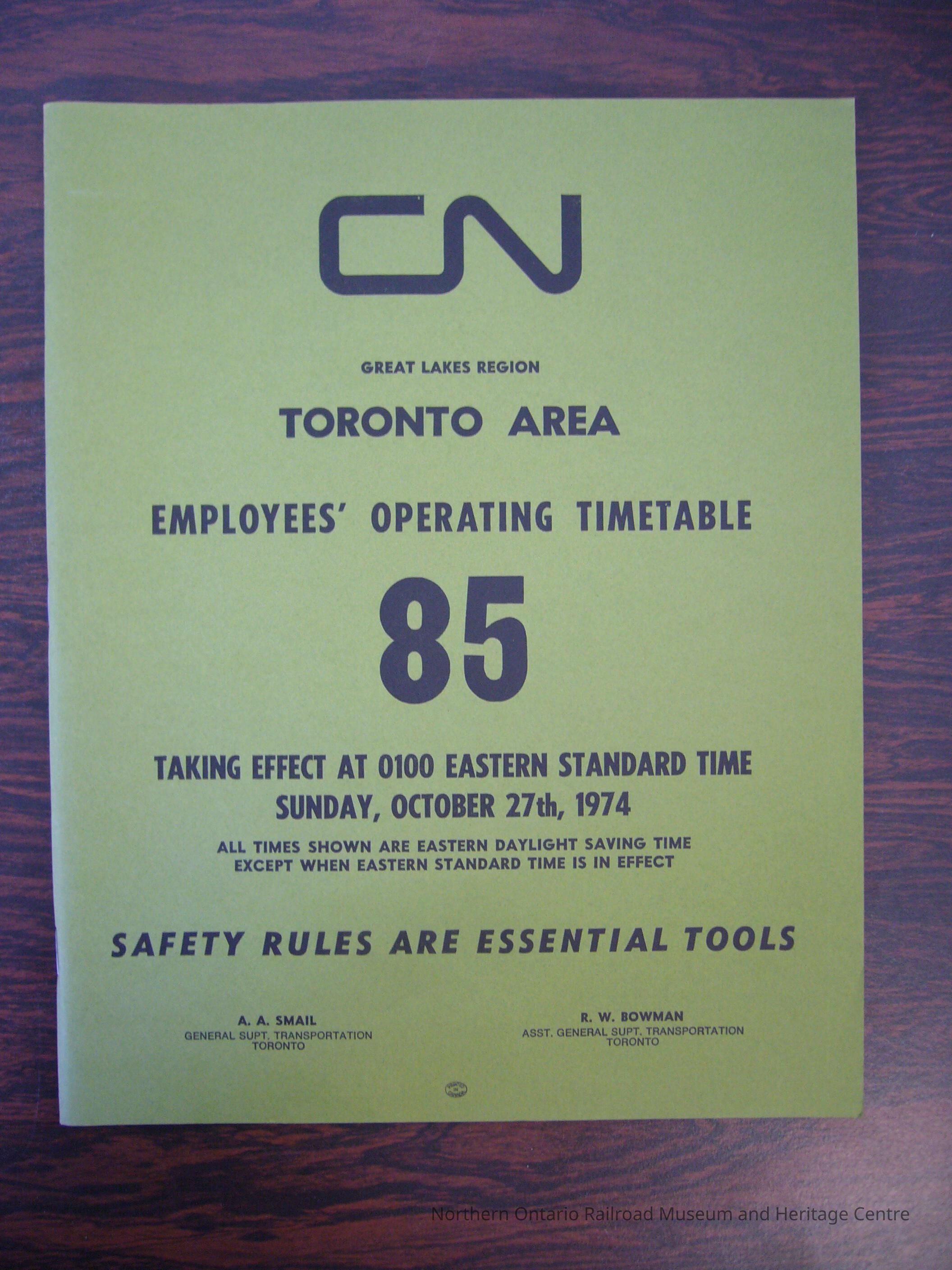 CN Great Lakes Region Toronto Area Employees' Operating Timetable 85, Taking Effect Sunday, October 27th, 1974.Collection