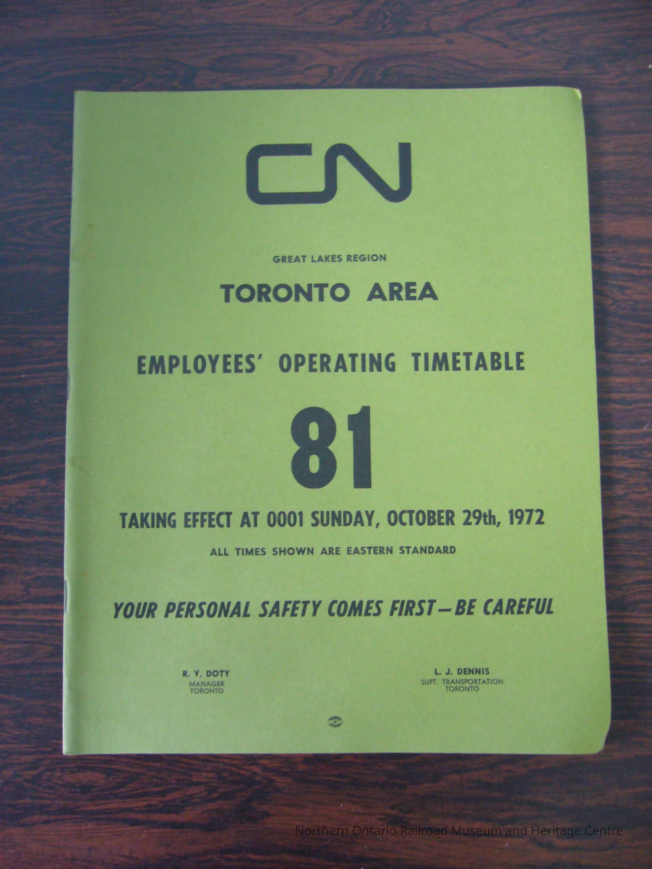 CN Great Lakes Region, Toronto Area, Employees' Operating Timetable No. 81, Taking Effect at 0001 Sunday, October 29th, 1972Collection