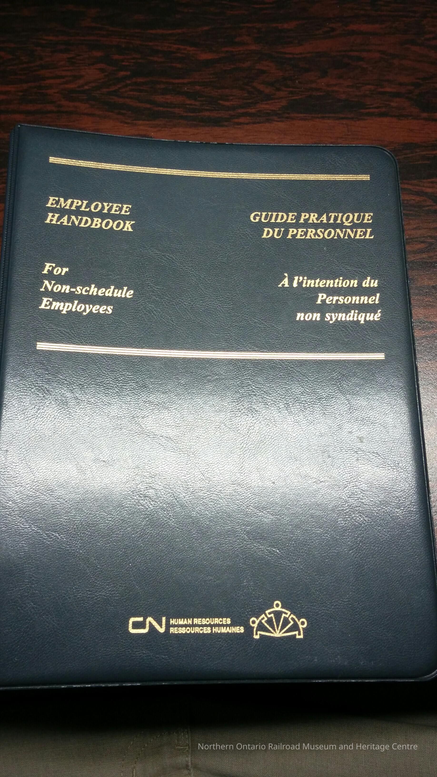 Book, employee handbook for Canadian National's non-schedule employees. It includes: mission statement, guiding principles, customer focus, safety, employee involvement, leadership, training, communication, quality, staffing, personal development and performance management, cash compensation, non-cash compensation, pensions, policies and practices, services